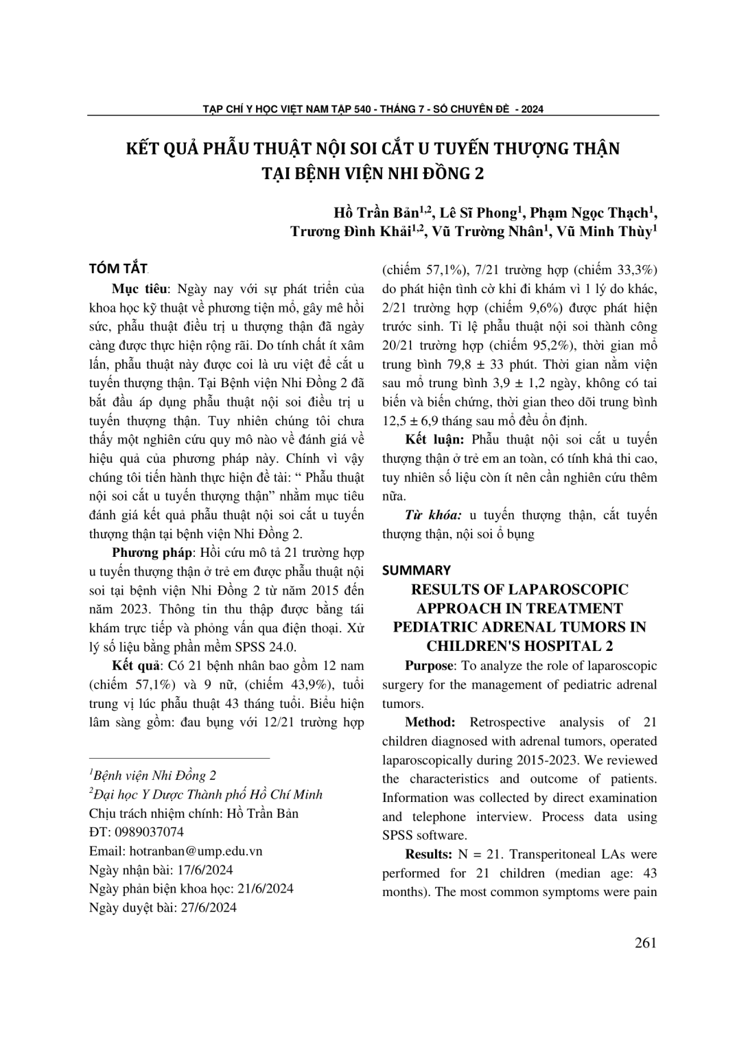 Ngày nay với sự phát triển của khoa học kỹ thuật về phương tiện mổ, gây mê hồi sức, phẫu thuật điều trị u thượng thận đã ngày càng được thực hiện rộng rãi. Do tính chất ít xâm lấn, phẫu thuật này được coi là ưu việt để cắt u tuyến thượng thận. Tại Bệnh viện Nhi Đồng 2 đã bắt đầu áp dụng phẫu thuật nội soi điều trị u tuyến thượng thận. Tuy nhiên chúng tôi chưa thấy một nghiên cứu quy mô nào về đánh giá về hiệu quả của phương pháp này. Chính vì vậy chúng tôi tiến hành thực hiện đề tài: “ Phẫu thuật nội soi cắt u tuyến thượng thận” nhằm mục tiêu đánh giá kết quả phẫu thuật nội soi cắt u tuyến thượng thận tại bệnh viện Nhi Đồng 2. Phương pháp: Hồi cứu mô tả 21 trường hợp u tuyến thượng thận ở trẻ em được phẫu thuật nội soi tại bệnh viện Nhi Đồng 2 từ năm 2015 đến năm 2023. Thông tin thu thập được bằng tái khám trực tiếp và phỏng vấn qua điện thoại. Xử lý số liệu bằng phần mềm SPSS 24.0. Kết quả: Có 21 bệnh nhân bao gồm 12 nam (chiếm 57,1%) và 9 nữ, (chiếm 43,9%), tuổi trung vị lúc phẫu thuật 43 tháng tuổi. Biểu hiện lâm sàng gồm: đau bụng với 12/21 trường hợp (chiếm 57,1%), 7/21 trường hợp (chiếm 33,3%) do phát hiện tình cờ khi đi khám vì 1 lý do khác, 2/21 trường hợp (chiếm 9,6%) được phát hiện trước sinh. Tỉ lệ phẫu thuật nội soi thành công 20/21 trường hợp (chiếm 95,2%), thời gian mổ trung bình 79,8 ± 33 phút. Thời gian nằm viện sau mổ trung bình 3,9 ± 1,2 ngày, không có tai biến và biến chứng, thời gian theo dõi trung bình 12,5 ± 6,9 tháng sau mổ đều ổn định. Kết luận: Phẫu thuật nội soi cắt u tuyến thượng thận ở trẻ em an toàn, có tính khả thi cao, tuy nhiên số liệu còn ít nên cần nghiên cứu thêm nữa.