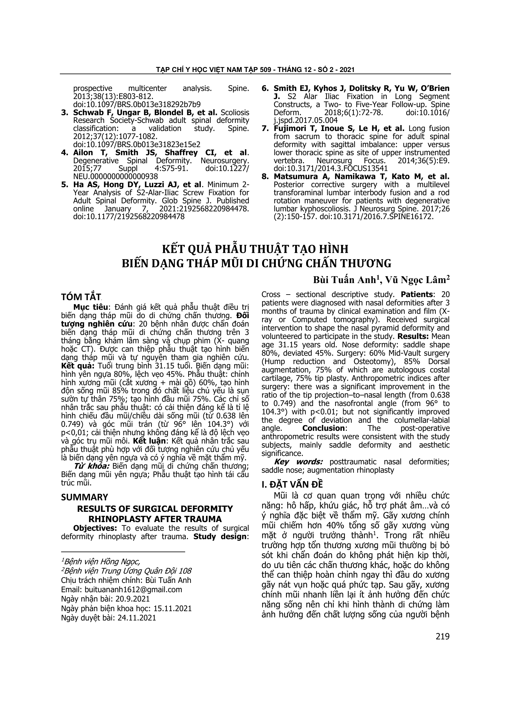Đánh giá kết quả phẫu thuật điều trị biến dạng tháp mũi do di chứng chấn thương. Đối tượng nghiên cứu: 20 bệnh nhân được chẩn đoán biến dạng tháp mũi di chứng chấn thương trên 3 tháng bằng khám lâm sàng và chụp phim (X- quang hoặc CT). Được can thiệp phẫu thuật tạo hình biến dạng tháp mũi và tự nguyện tham gia nghiên cứu. Kết quả: Tuổi trung bình 31.15 tuổi. Biến dạng mũi: hình yên ngựa 80%, lệch vẹo 45%. Phẫu thuật: chỉnh hình xương mũi (cắt xương + mài gồ) 60%, tạo hình độn sống mũi 85% trong đó chất liệu chủ yếu là sụn sườn tự thân 75%; tạo hình đầu mũi 75%. Các chỉ số nhân trắc sau phẫu thuật: có cải thiện đáng kể là tỉ lệ hình chiếu đầu mũi/chiều dài sống mũi (từ 0.638 lên 0.749) và góc mũi trán (từ 96° lên 104.3°) với p<0,01; cải thiện nhưng không đáng kể là độ lệch vẹo và góc trụ mũi môi. Kết luận: Kết quả nhân trắc sau phẫu thuật phù hợp với đối tượng nghiên cứu chủ yếu là biến dạng yên ngựa và có ý nghĩa về mặt thẩm mỹ.