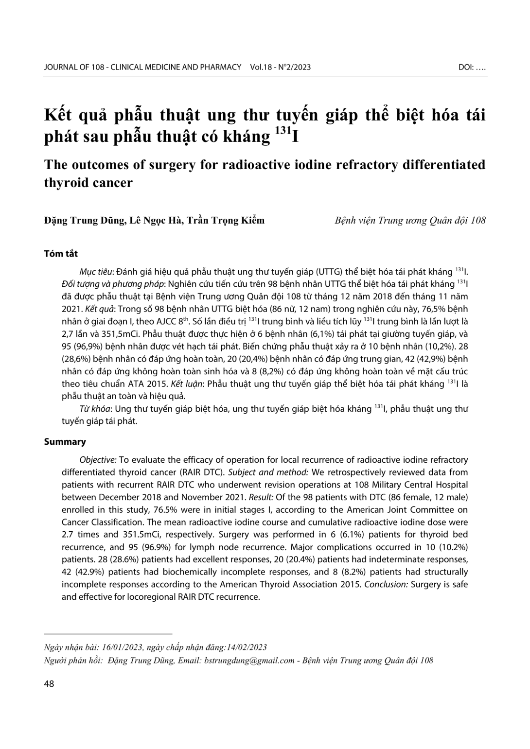 Đánh giá hiệu quả phẫu thuật ung thư tuyến giáp (UTTG) thể biệt hóa tái phát kháng 131I. Đối tượng và phương pháp: Nghiên cứu tiến cứu trên 98 bệnh nhân UTTG thể biệt hóa tái phát kháng 131I đã được phẫu thuật tại Bệnh viện Trung ương Quân đội 108 từ tháng 12 năm 2018 đến tháng 11 năm 2021. Kết quả: Trong số 98 bệnh nhân UTTG biệt hóa (86 nữ, 12 nam) trong nghiên cứu này, 76,5% bệnh nhân ở giai đoạn I, theo AJCC 8th. Số lần điều trị 131I trung bình và liều tích lũy 131I trung bình là lần lượt là 2,7 lần và 351,5mCi. Phẫu thuật được thực hiện ở 6 bệnh nhân (6,1%) tái phát tại giường tuyến giáp, và 95 (96,9%) bệnh nhân được vét hạch tái phát. Biến chứng phẫu thuật xảy ra ở 10 bệnh nhân (10,2%). 28 (28,6%) bệnh nhân có đáp ứng hoàn toàn, 20 (20,4%) bệnh nhân có đáp ứng trung gian, 42 (42,9%) bệnh nhân có đáp ứng không hoàn toàn sinh hóa và 8 (8,2%) có đáp ứng không hoàn toàn về mặt cấu trúc theo tiêu chuẩn ATA 2015. Kết luận: Phẫu thuật ung thư tuyến giáp thể biệt hóa tái phát kháng 131I là phẫu thuật an toàn và hiệu quả.
