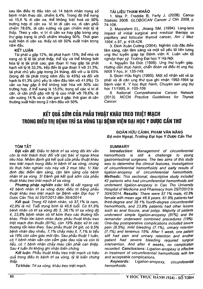 Introduction: Management of circumferential hemorrhoids is still a challenge to young gastrointestinal surgeons. The two aims of this study was to detennine the clinical features, investigations of circumferential hemorrhoids and early results of ligation-anopexy of circumferential hemorrhoids. Methods: This sectional, desctjptive study included 42 patients who had circumferential hemorrhoids and underwent ligation-anopexy in Can Tho University Hospital of Medicine and Phannacy from 25/7/2013 to 30/4/2014. Results: There were 57.1 percent male, 42.9 percent female with mean age 46.6 years. 61.9 percent patients had third-degree and 38.1 percent fourth-degree circumferential hemorrhoids, and 23,8 percent patients had other lesions such as anal fissure, anal polyp. Majority of patients underwent simple ligation-anopexy (81 percent) and the remainder underwent combined procedures (19 percent). One-day postoperative complications included severe pain (9.5 percent), mild bleeding (7.1 percent), urinary retention (7.1 percent) and ten emus 19 percent. After 1 week, one patient still had pain and urinary retention and another patient had severe bleeding required surgical intervention. And after 4 weeks, no complication recorded. Conclusions: Ligation-anopexy is effective in treatment of circumferential hemorrhoids with few and acceptable complications.