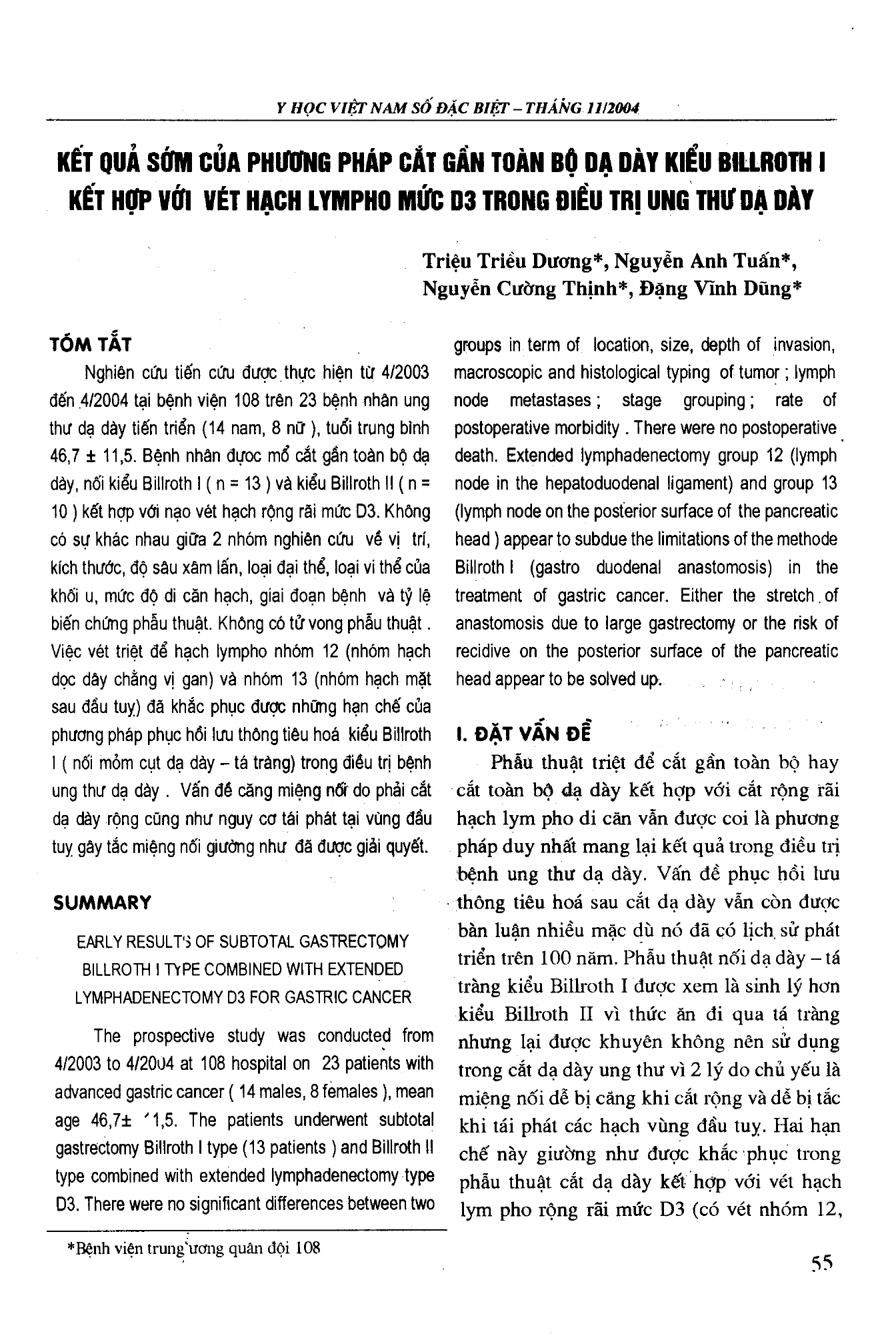 Kết quả sớm của phương pháp cắt gần toàn bộ dạ dày kiểu Billroth I kết hợp với vét hạch lympho mức D3 trong điều trị ung thư dạ dày