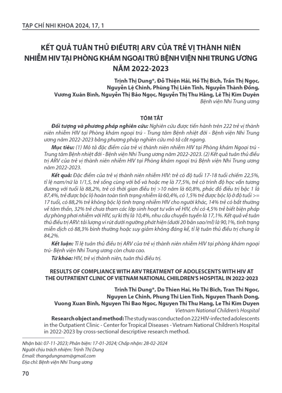 Nghiên cứu được tiến hành trên 222 trẻ vị thành niên nhiễm HIV tại Phòng khám ngoại trú - Trung tám Bệnh nhiệt đới - Bệnh viện Nhi Trung ương năm 2022-2023 bằng phương pháp nghiên cứu mô tả cắt ngang. Mục tiêu: (1) Mô tả đặc điểm của trẻ vi thành niên nhiễm HIV tại Phòng khám Ngoại trú -Trung tâm Bệnh nhiệt đới - Bệnh viện Nhi Trung ương năm 2022-2023. (2) Kết quả tuân thủ điều trị ARV của trẻ vị thành niên nhiễm HIV tại Phòng khám ngoại trú Bệnh viện Nhi Trung ương năm 2022-2023. Kết quả: Đặc điềm của trẻ vi thành niên nhiễm HIV: trẻ có độ tuổi 17-18 tuổi chiếm 22,5%, tỉ lệ nam /nữ là 1/1,5, trẻ sống cùng với bố và hoặc mẹ là 77,5%, trẻ có trình độ học vấn tương đương với tuồi là 88,2%, trẻ có thời gian điều trị >10 năm là 60,8%, phác đổ điều tri bậc 1 là 87,4%, trẻ được bộc lộ hoàn toàn tình trạng nhiễm là 60,4%, có 1,5% trẻ được bộc lộ ở độ tuổi >= 17 tuổi, có 88,2% trẻ không bộc lộ tình trạng nhiễm HIV cho người khác, 14% trẻ có bất thường về tâm thần, 32% trẻ chưa tham các lớp sinh hoạt tư vấn về HIV, chỉ có 4,5% trẻ biết biện pháp dự phòng phơi nhiễm với HIV, sự kì thi là 10,4%, nhu cầu chuyền tuyến là 17,1 %. Kết quả về tuân thủ điều tri ARV: tải lượng vi rút dưới ngưỡng phớt hiện (dưới 20 bản sao/ml) là 90,1 %, tình trạng miễn dịch có 88,3% bình thường hoặc suy giảm không đáng kề, tỉ lệ tuân thủ điều trị chung lờ 84,2%. Kết luận: Tỉ lệ tuân thủ điều trịARV của trẻ vị thành niên nhiễm HIV tại phòng khám ngoại trú- Bệnh viện Nhi Trung ương còn chưa cao
