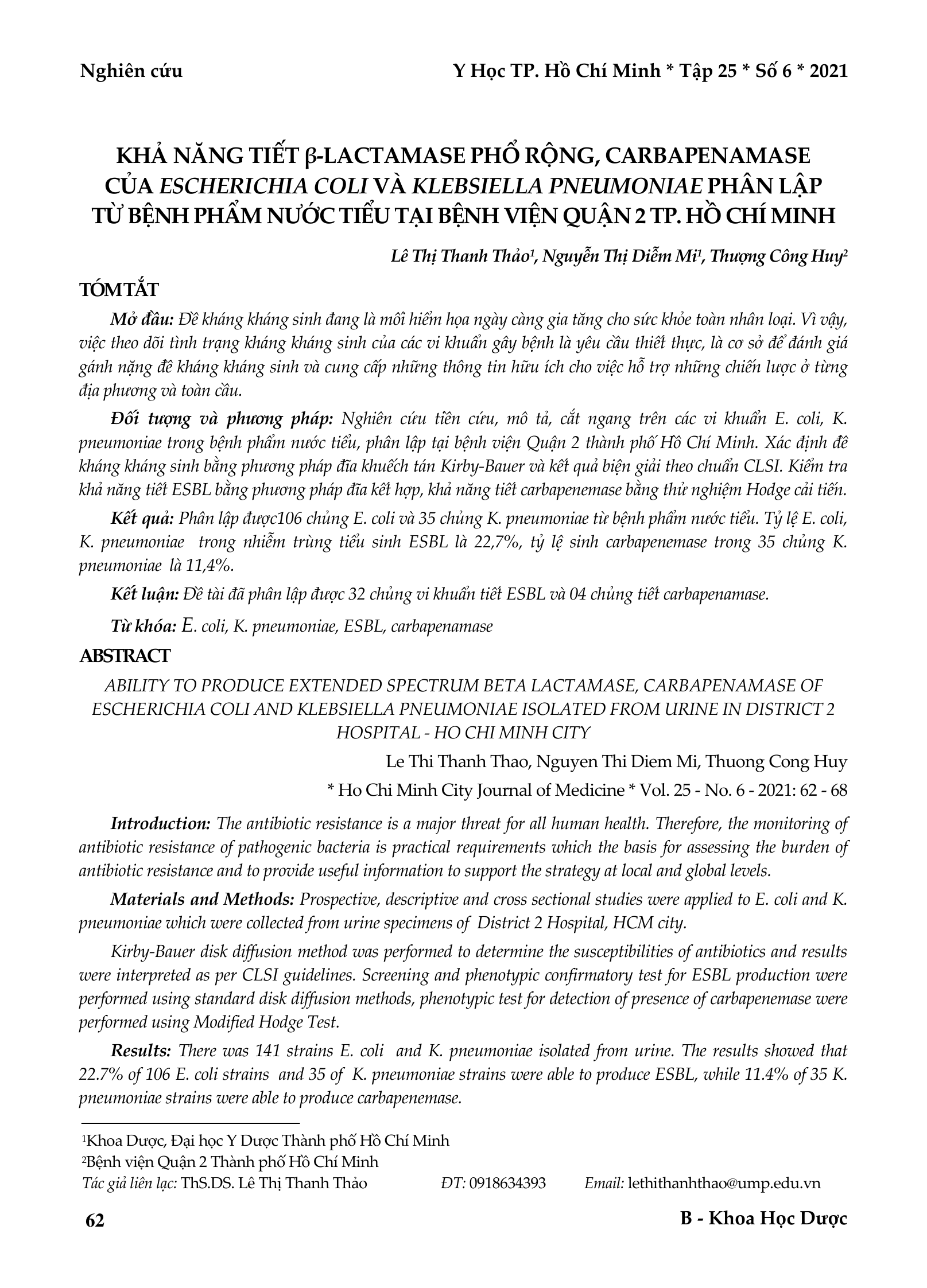 Đề kháng kháng sinh đang là mối hiểm họa ngày càng gia tăng cho sức khỏe toàn nhân loại. Vì vậy, việc theo dõi tình trạng kháng kháng sinh của các vi khuẩn gây bệnh là yêu cầu thiết thực, là cơ sở để đánh giá gánh nặng đề kháng kháng sinh và cung cấp những thông tin hữu ích cho việc hỗ trợ những chiến lược ở từng địa phương và toàn cầu. Đối tượng và phương pháp: Nghiên cứu tiền cứu, mô tả, cắt ngang trên các vi khuẩn E. coli, K. pneumoniae trong bệnh phẩm nước tiểu, phân lập tại bệnh viện Quận 2 thành phố Hồ Chí Minh. Xác định đề kháng kháng sinh bằng phương pháp đĩa khuếch tán Kirby-Bauer và kết quả biện giải theo chuẩn CLSI. Kiểm tra khả năng tiết ESBL bằng phương pháp đĩa kết hợp, khả năng tiết carbapenemase bằng thử nghiệm Hodge cải tiến. Kết quả: Phân lập được106 chủng E. coli và 35 chủng K. pneumoniae từ bệnh phẩm nước tiểu. Tỷ lệ E. coli, K. pneumoniae trong nhiễm trùng tiểu sinh ESBL là 22,7%, tỷ lệ sinh carbapenemase trong 35 chủng K. pneumoniae là 11,4%. Kết luận: Đề tài đã phân lập được 32 chủng vi khuẩn tiết ESBL và 04 chủng tiết carbapenamase.
