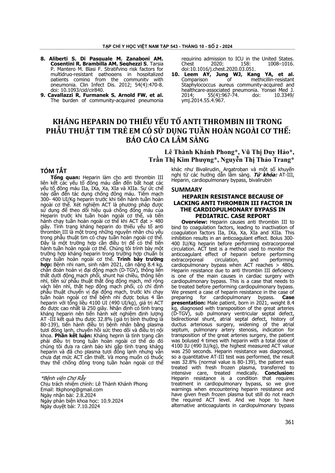 Heparin làm cho anti thrombin III liên kết các yếu tố đông máu dẫn đến bất hoạt các yếu tố đông máu IIa, IXa, Xa, XIa và XIIa. Sự ức chế này dẫn đến tác dụng chống đông máu. Tiêm mạch 300- 400 UI/Kg heparin trước khi tiến hành tuần hoàn ngoài cơ thể. Xét nghiệm ACT là phương pháp được sử dụng để theo dõi hiệu quả chống đông máu của Heparin trước khi tuần hoàn ngoài cơ thể, và tiến hành chạy tuần hoàn ngoài cơ thể khi ACT đạt > 480 giây. Tình trạng kháng heparin do thiếu yếu tố anti thrombin III là một trong những nguyên nhân chủ yếu trong phẫu thuật tim có chạy tuần hoàn ngoài cơ thể. Đây là một trường hợp cần điều trị để có thể tiến hành tuần hoàn ngoài cơ thể. Chúng tôi trình bày một trường hợp kháng heparin trong trường hợp chuẩn bị chạy tuần hoàn ngoài cơ thể. Trình bày trường hợp: Bệnh nhi nam, sinh năm 2021, cân nặng 8.4 kg, chẩn đoán hoán vị đại động mạch (D-TGV), thông liên thất dưới động mạch phổi, shunt hai chiều, thông liên nhĩ, tiền sử phẫu thuật thắt ống động mạch, mở rộng vách liên nhĩ, thắt hẹp động mạch phổi, có chỉ định phẫu thuật chuyển vị đại động mạch, trước khi chạy tuần hoàn ngoài cơ thể bệnh nhi được bolus 4 lần heparin với tổng liều 4100 UI (490 UI/kg), giá trị ACT đo được cao nhất là 250 giây. Nhận định có tình trạng kháng heparin nên tiến hành xét nghiệm định lượng AT -III kết quả thu được 32.8% (giá trị bình thường là 80-139), tiến hành điều trị bệnh nhân bằng plasma tươi đông lạnh, chuyển hồi sức theo dõi và điều trị nội khoa. Phần kết luận: Kháng heprin là tình trạng cần phải điều trị trong tuần hoàn ngoài cơ thể do đó chúng tôi đưa ra cảnh báo khi gặp tình trạng kháng heparin và đã cho plasma tươi đông lạnh nhưng vẫn chưa đạt mức ACT cần thiết. Và mong muốn có thuốc thay thế chống đông trong tuần hoàn ngoài cơ thể khác như Bivalirudin, Argatroban và một số khuyến nghị từ các hướng dẫn lâm sàng.