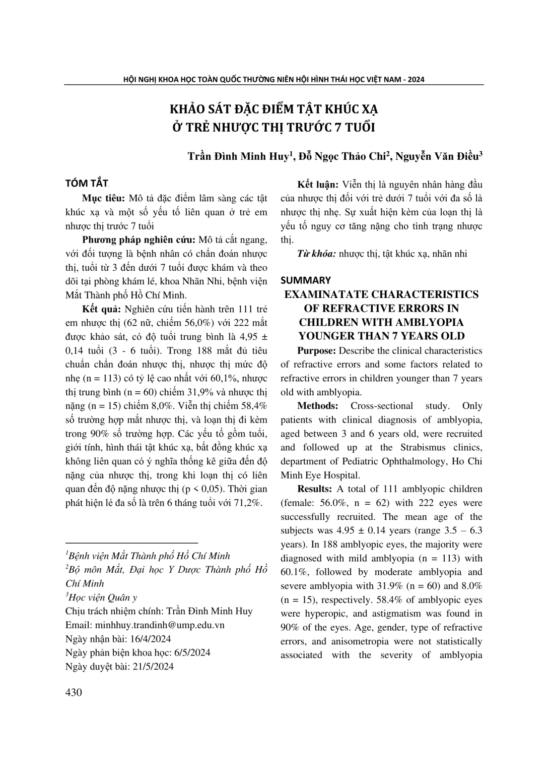 Mô tả đặc điểm lâm sàng các tật khúc xạ và một số yếu tố liên quan ở trẻ em nhược thị trước 7 tuổi Phương pháp nghiên cứu: Mô tả cắt ngang, với đối tượng là bệnh nhân có chẩn đoán nhược thị, tuổi từ 3 đến dưới 7 tuổi được khám và theo dõi tại phòng khám lé, khoa Nhãn Nhi, bệnh viện Mắt Thành phố Hồ Chí Minh. Kết quả: Nghiên cứu tiến hành trên 111 trẻ em nhược thị (62 nữ, chiếm 56,0%) với 222 mắt được khảo sát, có độ tuổi trung bình là 4,95 ± 0,14 tuổi (3 - 6 tuổi). Trong 188 mắt đủ tiêu chuẩn chẩn đoán nhược thị, nhược thị mức độ nhẹ (n = 113) có tỷ lệ cao nhất với 60,1%, nhược thị trung bình (n = 60) chiếm 31,9% và nhược thị nặng (n = 15) chiếm 8,0%. Viễn thị chiếm 58,4% số trường hợp mắt nhược thị, và loạn thị đi kèm trong 90% số trường hợp. Các yếu tố gồm tuổi, giới tính, hình thái tật khúc xạ, bất đồng khúc xạ không liên quan có ý nghĩa thống kê giữa đến độ nặng của nhược thị, trong khi loạn thị có liên quan đến độ nặng nhược thị (p < 0,05). Thời gian phát hiện lé đa số là trên 6 tháng tuổi với 71,2%. Kết luận: Viễn thị là nguyên nhân hàng đầu của nhược thị đối với trẻ dưới 7 tuổi với đa số là nhược thị nhẹ. Sự xuất hiện kèm của loạn thị là yếu tố nguy cơ tăng nặng cho tình trạng nhược thị.