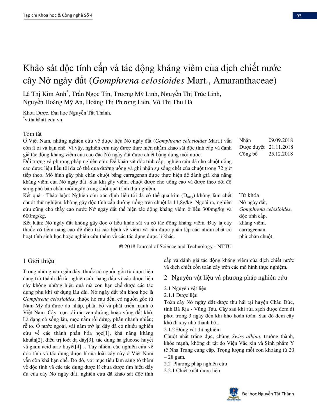 Ở Việt Nam, những nghiên cứu về dược liệu Nở ngày đất (Gomphrena celosioides Mart.) vẫn còn ít ỏi và hạn chế. Vì vậy, nghiên cứu này được thực hiện nhằm khảo sát độc tính cấp và đánh giá tác động kháng viêm của cao đặc Nở ngày đất được chiết bằng dung môi nước. Đối tượng và phương pháp nghiên cứu Để khảo sát độc tính cấp, nghiên cứu đã cho chuột uống cao dược liệu liều tối đa có thể qua đường uống và ghi nhận sự sống chết của chuột trong 72 giờ tiếp theo. Mô hình gây phù chân chuột bằng carragenan được thực hiện để đánh giá khả năng kháng viêm của Nở ngày đất. Sau khi gây viêm, chuột được cho uống cao và được theo dõi độ sưng phù bàn chân mỗi ngày trong suốt quá trình thử nghiệm. Kết quả - Thảo luận Nghiên cứu xác định liều tối đa có thể qua kim (Dmax) không làm chết chuột thử nghiệm, không gây độc tính cấp đường uống trên chuột là 11,8g/kg. Ngoài ra, nghiên cứu cũng cho thấy cao nước Nở ngày đất thể hiện tác động kháng viêm ở liều 300mg/kg và 600mg/kg. Kết luận Nở ngày đất không gây độc ở liều khảo sát và có tác động kháng viêm. Đây là cây thuốc có tiềm năng cao để điều trị các bệnh về viêm và cần được phân lập các nhóm chất có hoạt tính sinh học hoặc nghiên cứu thêm về các tác dụng dược lí khác.