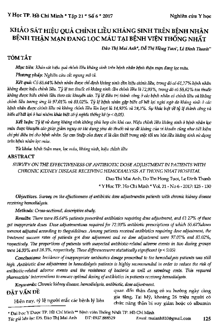 Khảo sát hiệu quả chỉnh liều kháng sinh trên bệnh nhân bệnh thận mạn đang lọc máu tại bệnh viện Thống Nhất