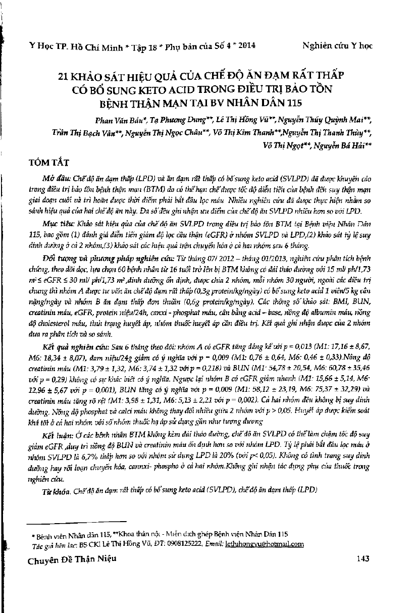 Khảo sát hiệu quả của chế độ ăn đạm rất thấp có bổ sung Keto Acid trong điều trị bảo tồn bệnh thận mạn tại Bệnh viện Nhân dân 115