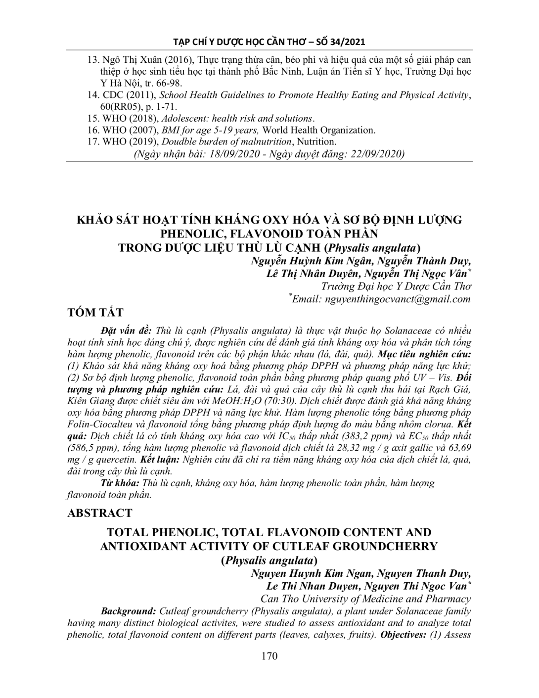 Khảo sát khả năng kháng oxy hoá bằng phương pháp DPPH và phương pháp năng lực khử và sơ bộ định lượng phenolic, flavonoid toàn phần bằng phương pháp quang phổ UV – Vis. Đối tượng và phương pháp nghiên cứu: Lá, đài và quả của cây thù lù cạnh thu hái tại Rạch Giá, Kiên Giang được chiết siêu âm với MeOH:H2O (70:30). Dịch chiết được đánh giá khả năng kháng oxy hóa bằng phương pháp DPPH và năng lực khử. Hàm lượng phenolic tổng bằng phương pháp Folin-Ciocalteu và flavonoid tổng bằng phương pháp định lượng đo màu bằng nhôm clorua. Kết quả: Dịch chiết lá có tính kháng oxy hóa cao với IC50 thấp nhất (383,2 ppm) và EC50 thấp nhất (586,5 ppm), tổng hàm lượng phenolic và flavonoid dịch chiết là 28,32 mg / g axit gallic và 63,69 mg / g quercetin. Kết luận: Nghiên cứu đã chỉ ra tiềm năng kháng oxy hóa của dịch chiết lá, quả, đài trong cây thù lù cạnh.