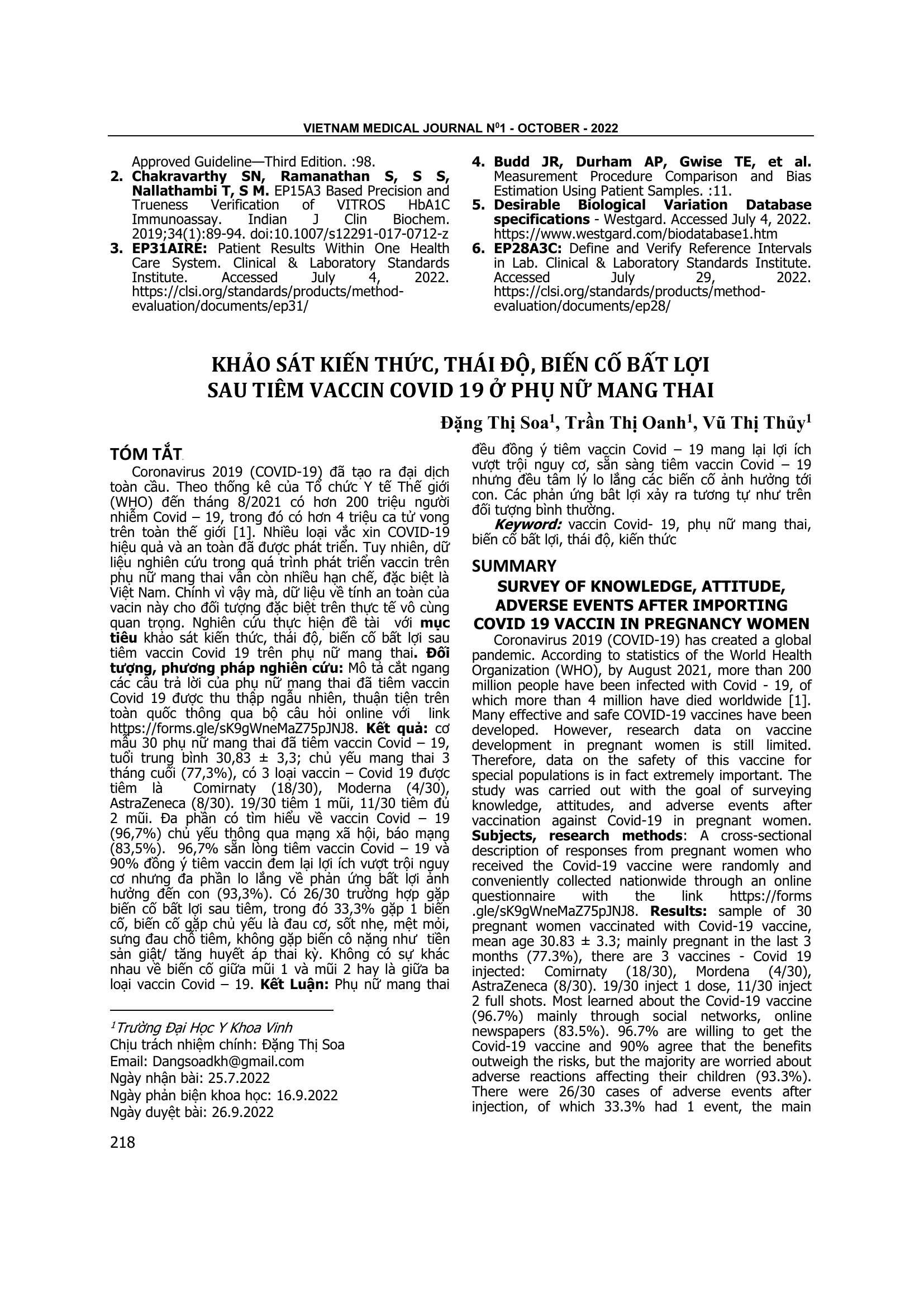 Coronavirus 2019 (COVID-19) đã tạo ra đại dịch toàn cầu. Theo thống kê của Tổ chức Y tế Thế giới (WHO) đến tháng 8/2021 có hơn 200 triệu người nhiễm Covid – 19, trong đó có hơn 4 triệu ca tử vong trên toàn thế giới [1]. Nhiều loại vắc xin COVID-19 hiệu quả và an toàn đã được phát triển. Tuy nhiên, dữ liệu nghiên cứu trong quá trình phát triển vaccin trên phụ nữ mang thai vẫn còn nhiều hạn chế, đặc biệt là Việt Nam. Chính vì vậy mà, dữ liệu về tính an toàn của vacin này cho đối tượng đặc biệt trên thực tế vô cùng quan trọng. Nghiên cứu thực hiện đề tài với mục tiêu khảo sát kiến thức, thái độ, biến cố bất lợi sau tiêm vaccin Covid 19 trên phụ nữ mang thai. Đối tượng, phương pháp nghiên cứu: Mô tả cắt ngang các câu trả lời của phụ nữ mang thai đã tiêm vaccin Covid 19 được thu thập ngẫu nhiên, thuận tiện trên toàn quốc thông qua bộ câu hỏi online với link https://forms.gle/sK9gWneMaZ75pJNJ8. Kết quả: cơ mẫu 30 phụ nữ mang thai đã tiêm vaccin Covid – 19, tuổi trung bình 30,83 ± 3,3; chủ yếu mang thai 3 tháng cuối (77,3%), có 3 loại vaccin – Covid 19 được tiêm là Comirnaty (18/30), Moderna (4/30), AstraZeneca (8/30). 19/30 tiêm 1 mũi, 11/30 tiêm đủ 2 mũi. Đa phần có tìm hiểu về vaccin Covid – 19 (96,7%) chủ yếu thông qua mạng xã hội, báo mạng (83,5%). 96,7% sẵn lòng tiêm vaccin Covid – 19 và 90% đồng ý tiêm vaccin đem lại lợi ích vượt trội nguy cơ nhưng đa phần lo lắng về phản ứng bất lợi ảnh hưởng đến con (93,3%). Có 26/30 trường hợp gặp biến cố bất lợi sau tiêm, trong đó 33,3% gặp 1 biến cố, biến cố gặp chủ yếu là đau cơ, sốt nhẹ, mệt mỏi, sưng đau chỗ tiêm, không gặp biến cô nặng như tiền sản giật/ tăng huyết áp thai kỳ. Không có sự khác nhau về biến cố giữa mũi 1 và mũi 2 hay là giữa ba loại vaccin Covid – 19. Kết Luận: Phụ nữ mang thai đều đồng ý tiêm vaccin Covid – 19 mang lại lợi ích vượt trội nguy cơ, sẵn sàng tiêm vaccin Covid – 19 nhưng đều tâm lý lo lắng các biến cố ảnh hưởng tới con. Các phản ứng bât lợi xảy ra tương tự như trên đối tượng bình thường.