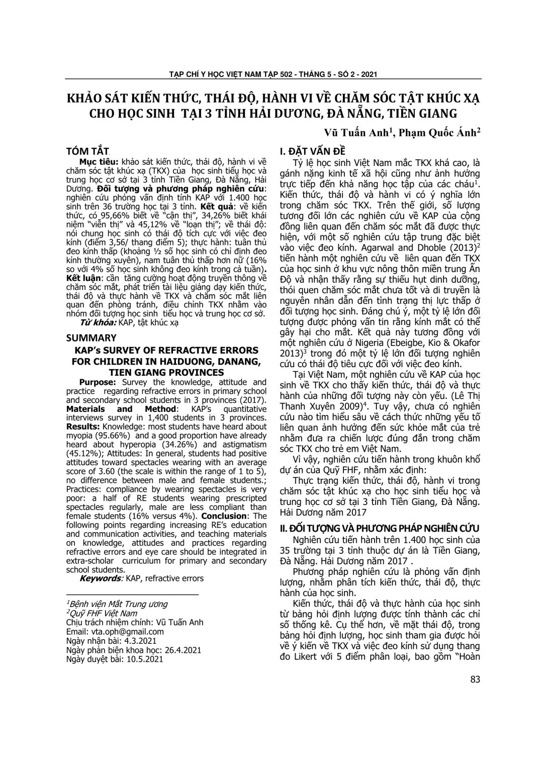 Khảo sát kiến thức, thái độ, hành vi về chăm sóc tật khúc xạ (TKX) của học sinh tiểu học và trung học cơ sở tại 3 tỉnh Tiền Giang, Đà Nẵng, Hải Dương. Đối tượng và phương pháp nghiên cứu: nghiên cứu phỏng vấn định tính KAP với 1.400 học sinh trên 36 trường học tại 3 tỉnh. Kết quả: về kiến thức, có 95,66% biết về “cận thị”, 34,26% biết khái niệm “viễn thị” và 45,12% về “loạn thị”; về thái độ: nói chung học sinh có thái độ tích cực với việc đeo kính (điểm 3,56/ thang điểm 5); thực hành: tuân thủ đeo kính thấp (khoảng ½ số học sinh có chỉ định đeo kính thường xuyên), nam tuân thủ thấp hơn nữ (16% so với 4% số học sinh không đeo kính trong cả tuần). Kết luận: cần tăng cường hoạt động truyền thông về chăm sóc mắt, phát triển tài liệu giảng dạy kiến thức, thái độ và thực hành về TKX và chăm sóc mắt liên quan đến phòng tránh, điều chỉnh TKX nhằm vào nhóm đối tượng học sinh tiểu học và trung học cơ sở.