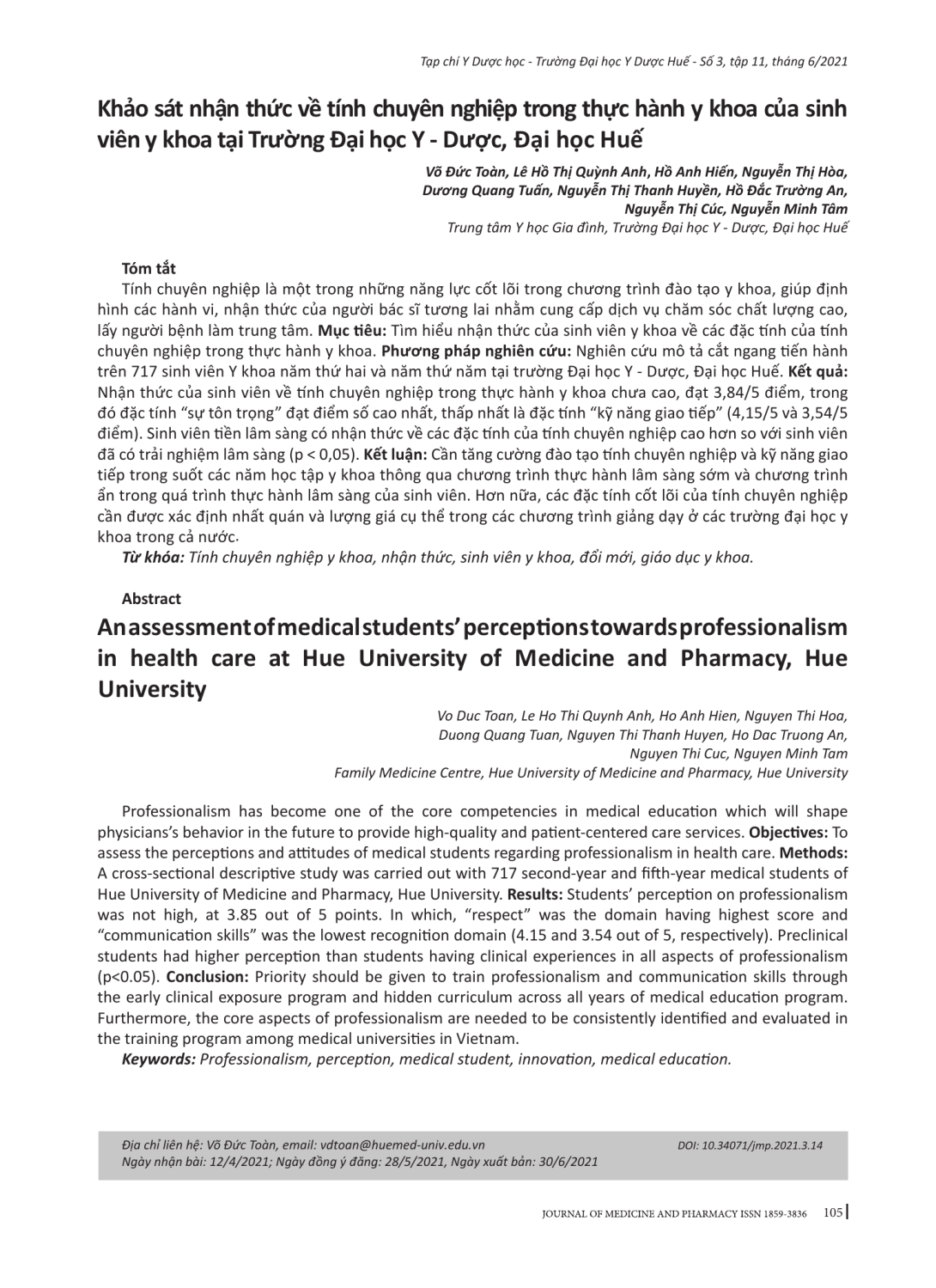 Tìm hiểu nhận thức của sinh viên y khoa về các đặc tính của tính chuyên nghiệp trong thực hành y khoa. Phương pháp nghiên cứu: Nghiên cứu mô tả cắt ngang tiến hành trên 717 sinh viên Y khoa năm thứ hai và năm thứ năm tại trường Đại học Y - Dược, Đại học Huế. Kết quả: Nhận thức của sinh viên về tính chuyên nghiệp trong thực hành y khoa chưa cao, đạt 3,84/5 điểm, trong đó đặc tính “sự tôn trọng” đạt điểm số cao nhất, thấp nhất là đặc tính “kỹ năng giao tiếp” (4,15/5 và 3,54/5 điểm). Sinh viên tiền lâm sàng có nhận thức về các đặc tính của tính chuyên nghiệp cao hơn so với sinh viên đã có trải nghiệm lâm sàng (p < 0,05). Kết luận: Cần tăng cường đào tạo tính chuyên nghiệp và kỹ năng giao tiếp trong suốt các năm học tập y khoa thông qua chương trình thực hành lâm sàng sớm và chương trình ẩn trong quá trình thực hành lâm sàng của sinh viên. Hơn nữa, các đặc tính cốt lõi của tính chuyên nghiệp cần được xác định nhất quán và lượng giá cụ thể trong các chương trình giảng dạy ở các trường đại học y khoa trong cả nước.