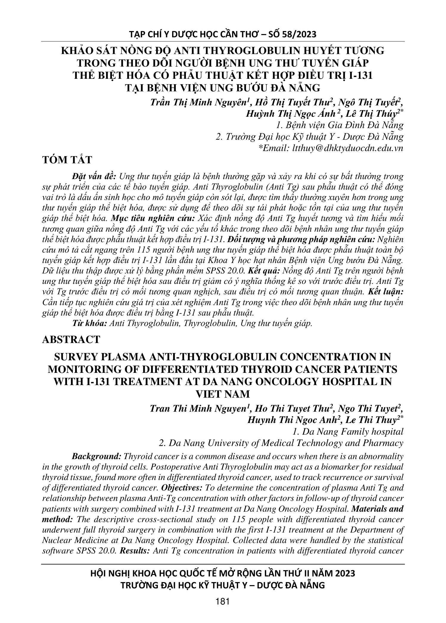 Xác định nồng độ Anti Tg huyết tương và tìm hiểu mối tương quan giữa nồng độ Anti Tg với các yếu tố khác trong theo dõi bệnh nhân ung thư tuyến giáp thể biệt hóa được phẫu thuật kết hợp điều trị I-131. Đối tượng và phương pháp nghiên cứu: Nghiên cứu mô tả cắt ngang trên 115 người bệnh ung thư tuyến giáp thể biệt hóa được phẫu thuật toàn bộ tuyến giáp kết hợp điều trị I-131 lần đầu tại Khoa Y học hạt nhân Bệnh viện Ung bướu Đà Nẵng. Dữ liệu thu thập được xử lý bằng phần mềm SPSS 20.0. Kết quả: Nồng độ Anti Tg trên người bệnh ung thư tuyến giáp thể biệt hóa sau điều trị giảm có ý nghĩa thống kê so với trước điều trị. Anti Tg với Tg trước điều trị có mối tương quan nghịch, sau điều trị có mối tương quan thuận. Kết luận: Cần tiếp tục nghiên cứu giá trị của xét nghiệm Anti Tg trong việc theo dõi bệnh nhân ung thư tuyến giáp thể biệt hóa được điều trị bằng I-131 sau phẫu thuật.