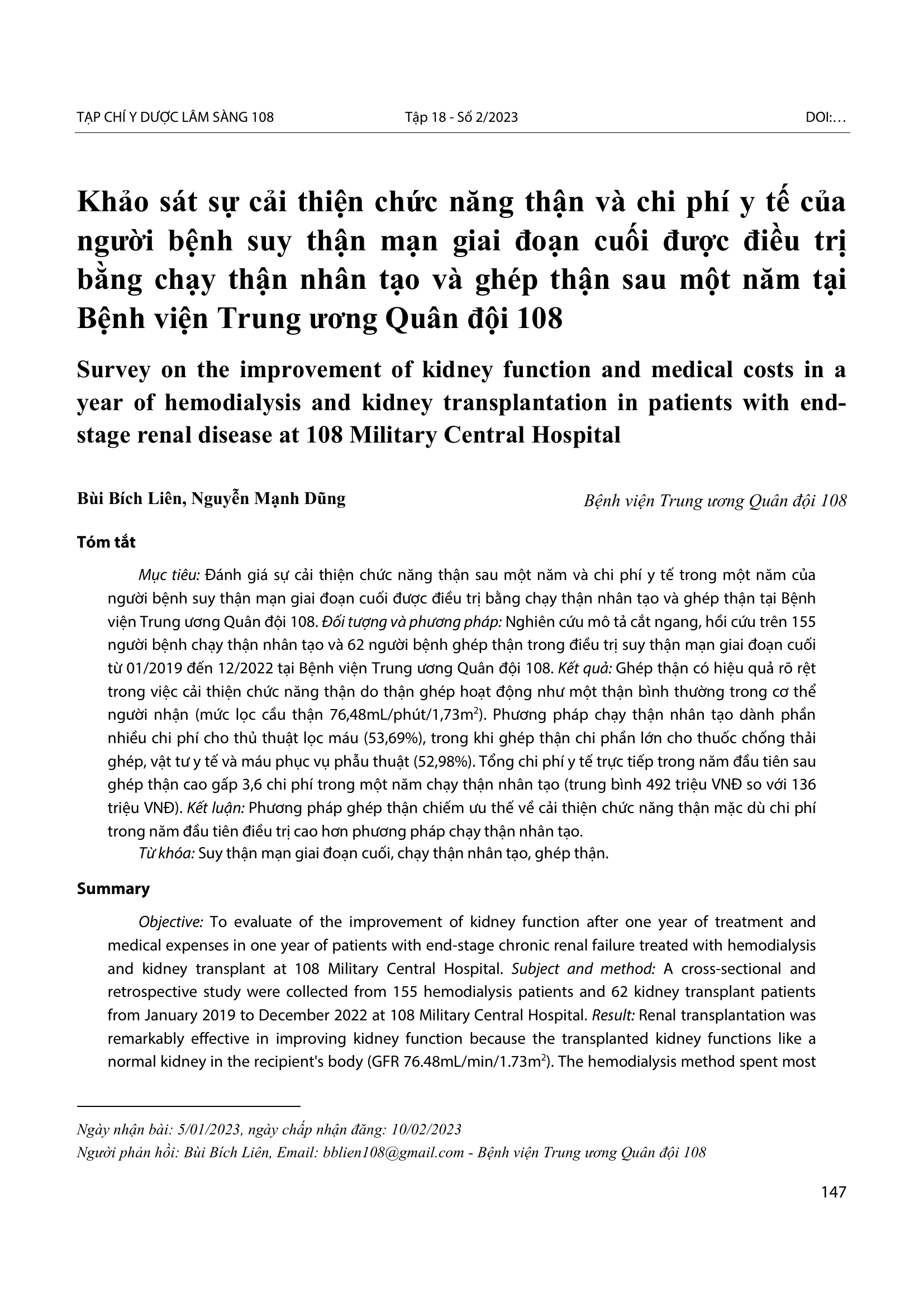 Đánh giá sự cải thiện chức năng thận sau một năm và chi phí y tế trong một năm của người bệnh suy thận mạn giai đoạn cuối được điều trị bằng chạy thận nhân tạo và ghép thận tại Bệnh viện Trung ương Quân đội 108. Đối tượng và phương pháp: Nghiên cứu mô tả cắt ngang, hồi cứu trên 155 người bệnh chạy thận nhân tạo và 62 người bệnh ghép thận trong điều trị suy thận mạn giai đoạn cuối từ 01/2019 đến 12/2022 tại Bệnh viện Trung ương Quân đội 108. Kết quả: Ghép thận có hiệu quả rõ rệt trong việc cải thiện chức năng thận do thận ghép hoạt động như một thận bình thường trong cơ thể người nhận (mức lọc cầu thận 76,48mL/phút/1,73m2). Phương pháp chạy thận nhân tạo dành phần nhiều chi phí cho thủ thuật lọc máu (53,69%), trong khi ghép thận chi phần lớn cho thuốc chống thải ghép, vật tư y tế và máu phục vụ phẫu thuật (52,98%). Tổng chi phí y tế trực tiếp trong năm đầu tiên sau ghép thận cao gấp 3,6 chi phí trong một năm chạy thận nhân tạo (trung bình 492 triệu VNĐ so với 136 triệu VNĐ). Kết luận: Phương pháp ghép thận chiếm ưu thế về cải thiện chức năng thận mặc dù chi phí trong năm đầu tiên điều trị cao hơn phương pháp chạy thận nhân tạo.