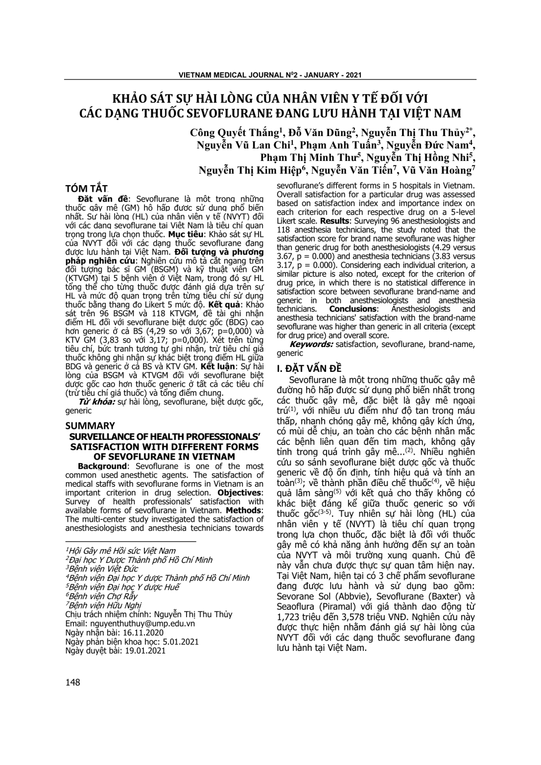 Sevoflurane là một trong những thuốc gây mê (GM) hô hấp được sử dụng phổ biến nhất. Sự hài lòng (HL) của nhân viên y tế (NVYT) đối với các dạng sevoflurane tại Việt Nam là tiêu chí quan trọng trong lựa chọn thuốc. Mục tiêu: Khảo sát sự HL của NVYT đối với các dạng thuốc sevoflurane đang được lưu hành tại Việt Nam. Đối tượng và phương pháp nghiên cứu: Nghiên cứu mô tả cắt ngang trên đối tượng bác sĩ GM (BSGM) và kỹ thuật viên GM (KTVGM) tại 5 bệnh viện ở Việt Nam, trong đó sự HL tổng thể cho từng thuốc được đánh giá dựa trên sự HL và mức độ quan trọng trên từng tiêu chí sử dụng thuốc bằng thang đo Likert 5 mức độ. Kết quả: Khảo sát trên 96 BSGM và 118 KTVGM, đề tài ghi nhận điểm HL đối với sevoflurane biệt dược gốc (BDG) cao hơn generic ở cả BS (4,29 so với 3,67; p=0,000) và KTV GM (3,83 so với 3,17; p=0,000). Xét trên từng tiêu chí, bức tranh tương tự ghi nhận, trừ tiêu chí giá thuốc không ghi nhận sự khác biệt trong điểm HL giữa BDG và generic ở cả BS và KTV GM. Kết luận: Sự hài lòng của BSGM và KTVGM đối với sevoflurane biệt dược gốc cao hơn thuốc generic ở tất cả các tiêu chí (trừ tiêu chí giá thuốc) và tổng điểm chung.