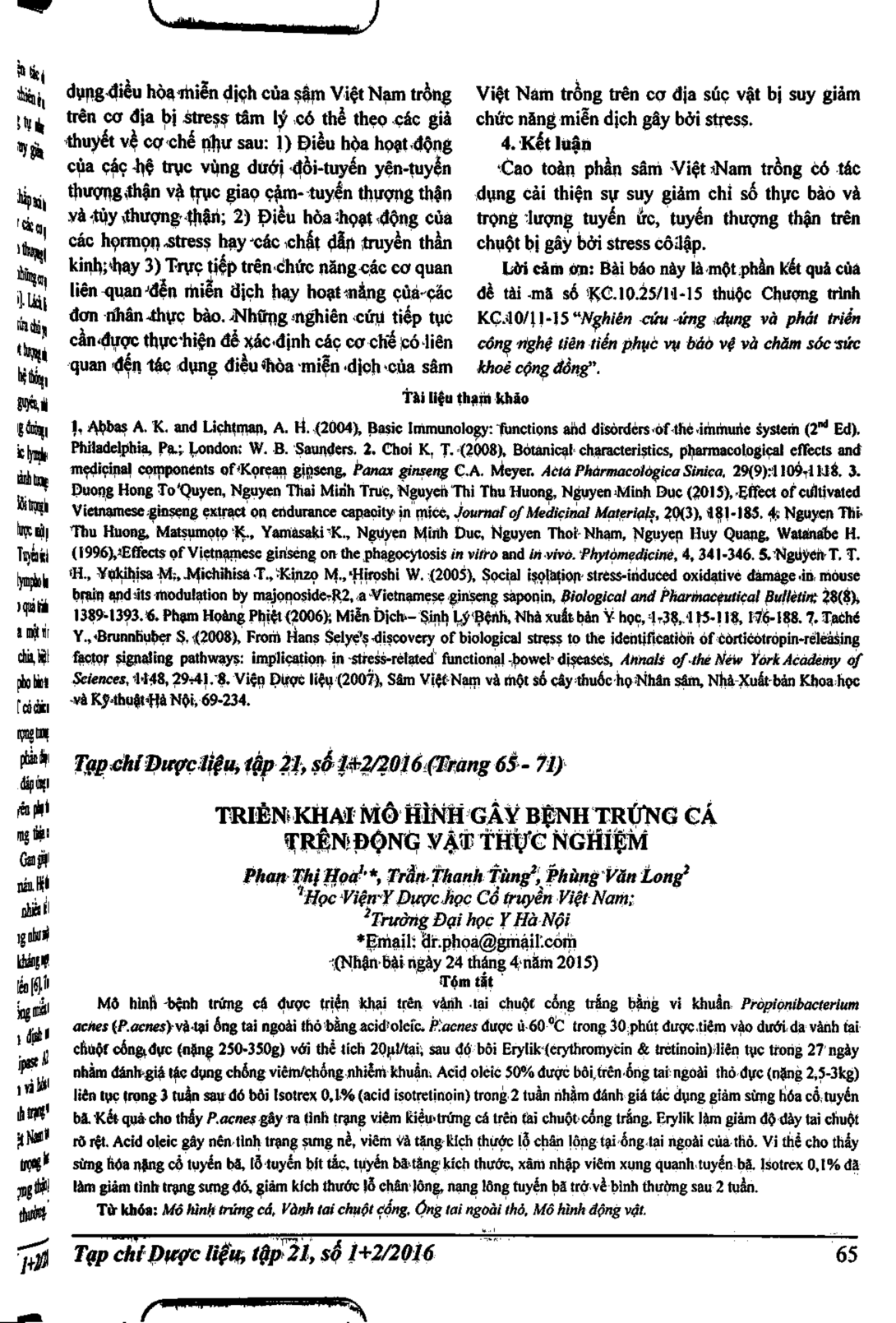 Khảo sát tác dụng của cao sâm Việt Nam trồng trên một số chức năng miễn dịch ở động vật bị gây stress cô lập