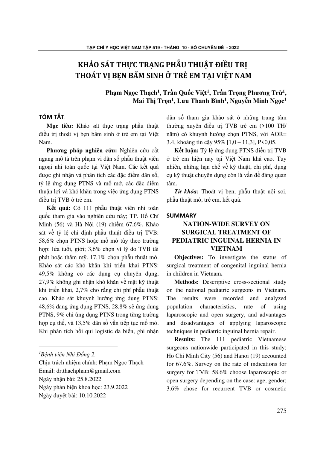 Khảo sát thực trạng phẫu thuật điều trị thoát vị bẹn bẩm sinh ở trẻ em tại Việt Nam. Phương pháp nghiên cứu: Nghiên cứu cắt ngang mô tả trên phạm vi dân số phẫu thuật viên ngoại nhi toàn quốc tại Việt Nam. Các kết quả được ghi nhận và phân tích các đặc điểm dân số, tỷ lệ ứng dụng PTNS và mổ mở, các đặc điểm thuận lợi và khó khăn trong việc ứng dụng PTNS điều trị TVB ở trẻ em. Kết quả: Có 111 phẫu thuật viên nhi toàn quốc tham gia vào nghiên cứu này; TP. Hồ Chí Minh (56) và Hà Nội (19) chiếm 67,6%. Khảo sát về tỷ lệ chỉ định phẫu thuật điều trị TVB: 58,6% chọn PTNS hoặc mổ mở tùy theo trường hợp: lứa tuổi, giới; 3,6% chọn vì lý do TVB tái phát hoặc thẩm mỹ. 17,1% chọn phẫu thuật mở. Khảo sát các khó khăn khi triển khai PTNS: 49,5% không có các dụng cụ chuyên dụng, 27,9% không ghi nhận khó khăn về mặt kỹ thuật khi triển khai, 2,7% cho rằng chi phí phẫu thuật cao. Khảo sát khuynh hướng ứng dụng PTNS: 48,6% đang ứng dụng PTNS, 28,8% sẽ ứng dụng PTNS, 9% chỉ ứng dụng PTNS trong từng trường hợp cụ thể, và 13,5% dân số vẫn tiếp tục mổ mở. Khi phân tích hồi qui logistic đa biến, ghi nhận dân số tham gia khảo sát ở những trung tâm thường xuyên điều trị TVB trẻ em (>100 TH/ năm) có khuynh hướng chọn PTNS, với AOR= 3.4, khoảng tin cậy 95% [1,0 – 11,3], P<0,05. Kết luận: Tỷ lệ ứng dụng PTNS điều trị TVB ở trẻ em hiện nay tại Việt Nam khá cao. Tuy nhiên, những hạn chế về kỹ thuật, chi phí, dụng cụ kỹ thuật chuyên dụng còn là vấn đề đáng quan tâm.