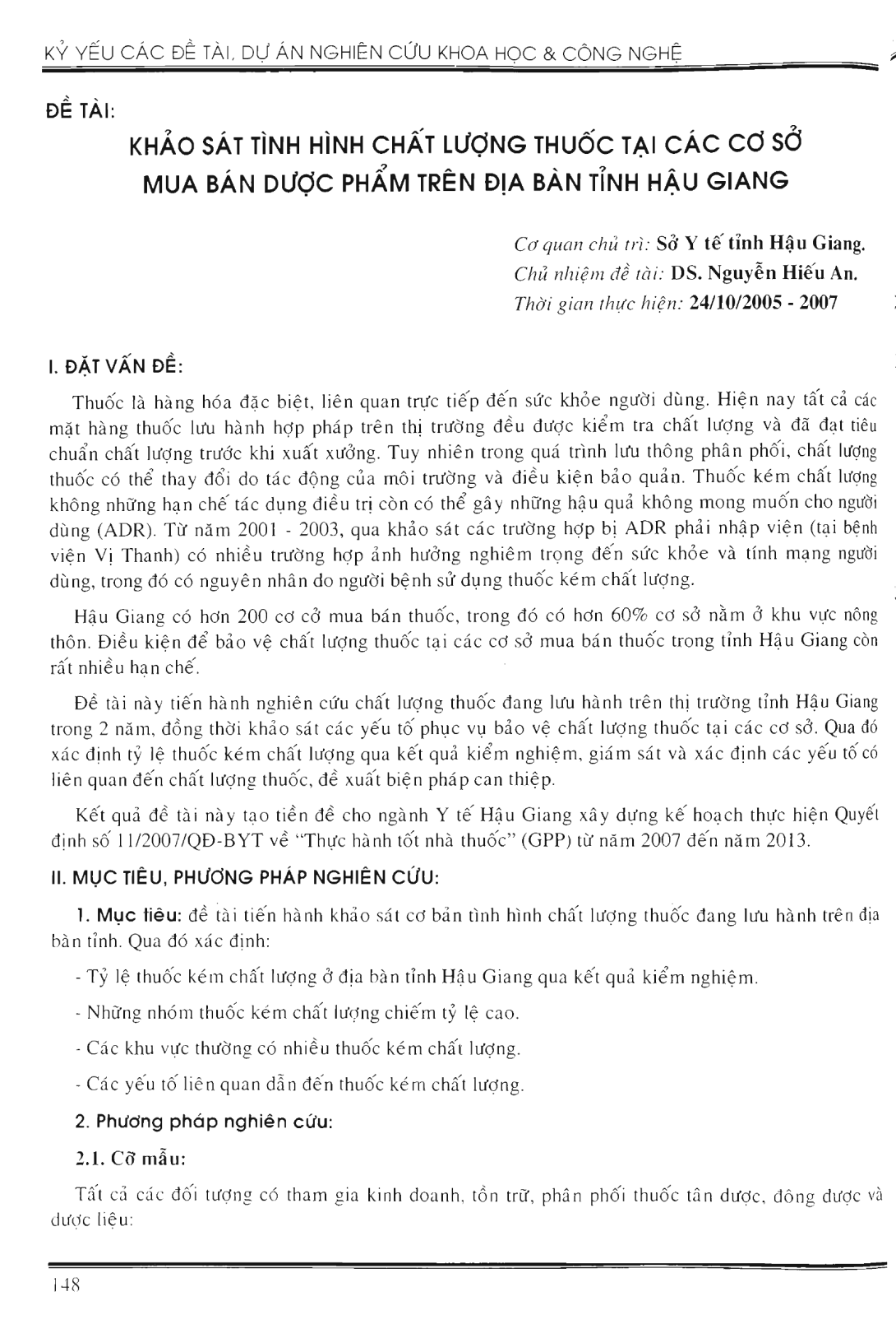 Khảo sát tình hình chất lượng thuốc tại các cơ sở mua bán dược phẩm trên địa bàn tỉnh Hậu Giang