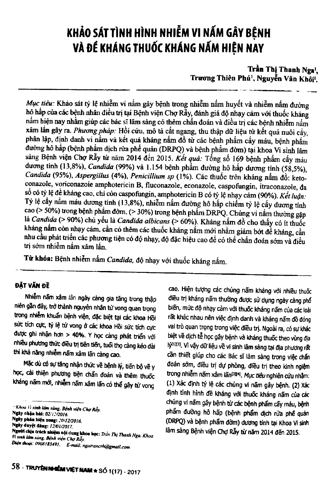 Tỷ lệ cấy nấm máu dương tính (13,8 phần trăm), nhiễm nấm đường hô hấp chiếm tỷ lệ cấy dương tính cao (50 phần trăm) trong bệnh phẩm đờm, (30 phần trăm) trong bệnh phẩm DRPQ. Chủng vi nấm thường gặp là Candida (90 phần trăm) chủ yếu là Candida albicans (60 phần trăm). Kháng nấm đồ cho thấy có ít thuốc kháng nấm còn nhạy cảm, cần có thêm các thuốc kháng nấm mới nhằm giảm bớt đề kháng, cần nhu cầu phát triển các phương tiện có độ nhạy, độ đặc hiệu cao để có thể chẩn đoán sớm và điều trị sớm nhiễm nấm xâm lấn.