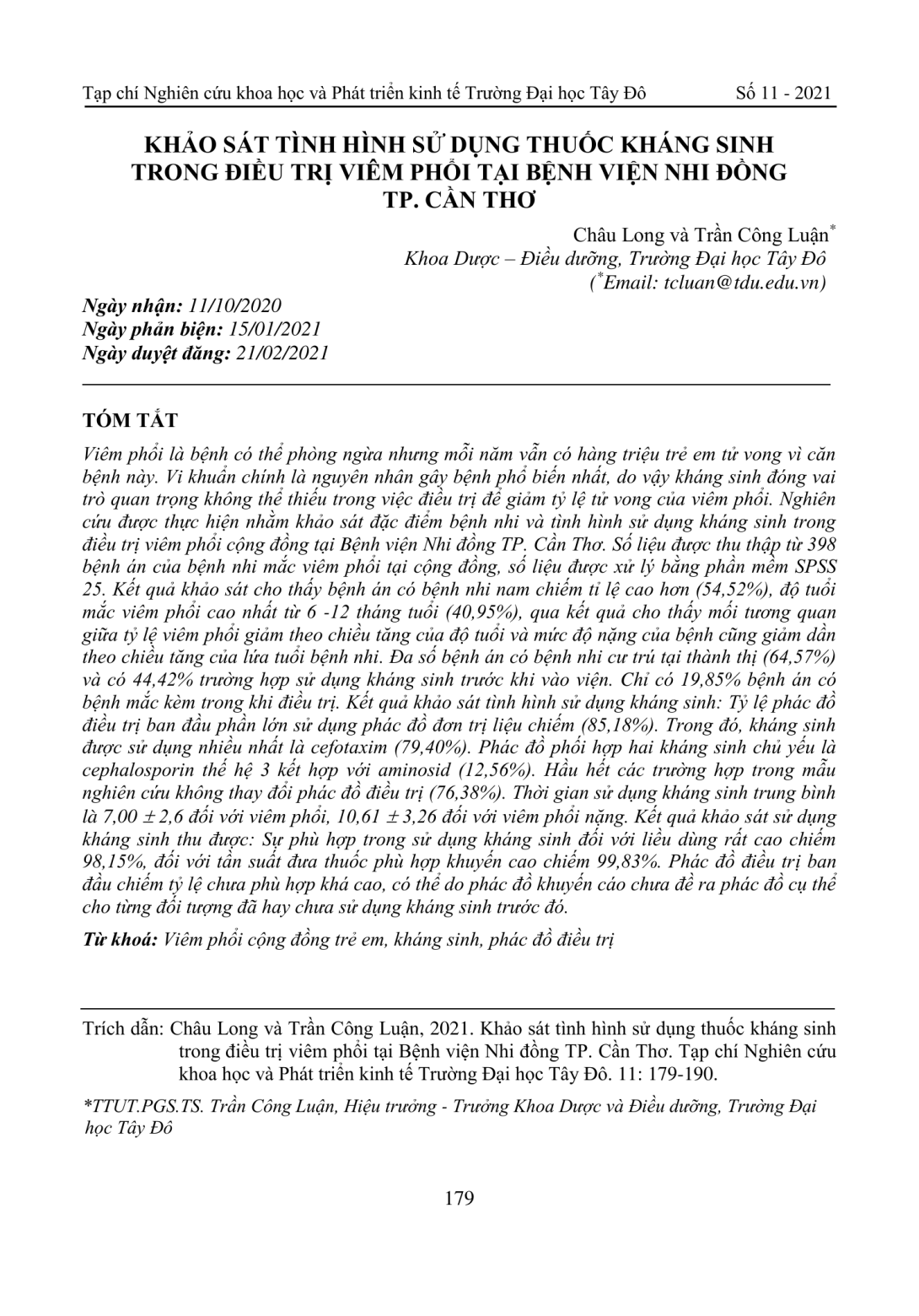 Khảo sát đặc điểm bệnh nhi và tình hình sử dụng kháng sinh trong điều trị viêm phổi cộng đồng tại Bệnh viện Nhi đồng TP. Cần Thơ. Số liệu được thu thập từ 398 bệnh án của bệnh nhi mắc viêm phổi tại cộng đồng, số liệu được xử lý bằng phần mềm SPSS 25. Kết quả khảo sát cho thấy bệnh án có bệnh nhi nam chiếm tỉ lệ cao hơn (54,52%), độ tuổi mắc viêm phổi cao nhất từ 6 -12 tháng tuổi (40,95%), qua kết quả cho thấy mối tương quan giữa tỷ lệ viêm phổi giảm theo chiều tăng của độ tuổi và mức độ nặng của bệnh cũng giảm dần theo chiều tăng của lứa tuổi bệnh nhi. Đa số bệnh án có bệnh nhi cư trú tại thành thị (64,57%) và có 44,42% trường hợp sử dụng kháng sinh trước khi vào viện. Chỉ có 19,85% bệnh án có bệnh mắc kèm trong khi điều trị. Kết quả khảo sát tình hình sử dụng kháng sinh Tỷ lệ phác đồ điều trị ban đầu phần lớn sử dụng phác đồ đơn trị liệu chiếm (85,18%). Trong đó, kháng sinh được sử dụng nhiều nhất là cefotaxim (79,40%). Phác đồ phối hợp hai kháng sinh chủ yếu là cephalosporin thế hệ 3 kết hợp với aminosid (12,56%). Hầu hết các trường hợp trong mẫu nghiên cứu không thay đổi phác đồ điều trị (76,38%). Thời gian sử dụng kháng sinh trung bình là 7,00 đối với viêm phổi, 10,61 đối với viêm phổi nặng. Kết quả khảo sát sử dụng kháng sinh thu được Sự phù hợp trong sử dụng kháng sinh đối với liều dùng rất cao chiếm 98,15%, đối với tần suất đưa thuốc phù hợp khuyến cao chiếm 99,83%. Phác đồ điều trị ban đầu chiếm tỷ lệ chưa phù hợp khá cao, có thể do phác đồ khuyến cáo chưa đề ra phác đồ cụ thể cho từng đối tượng đã hay chưa sử dụng kháng sinh trước đó.