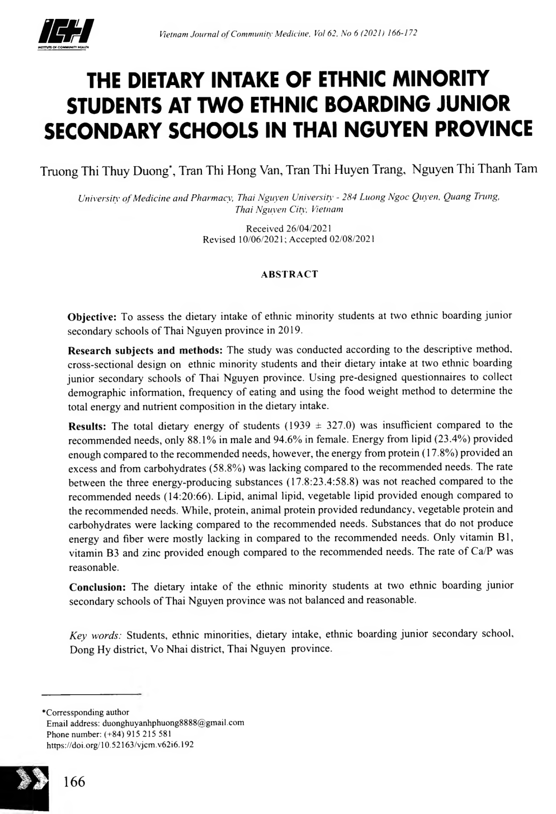 Đánh giá khẩu phần ăn của học sinh dân tộc thiểu số tại hai trường phổ thông dân tộc nội trú trung học cơ sở tỉnh Thái Nguyên năm 2019. Nghiên cứu được tiến hành trên 565 học sinh và khẩu phẩn ăn của học sinh tại hai trường phổ thông dân tộc nội trú trung học cơ sở của tỉnh Thái Nguyên với phương pháp mô tả thiết kế cắt ngang. Sử dụng bộ câu hỏi điều tra được thiết kế sẵn để thu thập các thông tin về nhân khẩu học, tần suất tiêu thụ thực phẩm. Sử dụng phương pháp cân đong thực phẩm để thu thập thông tin về mức tiêu thụ thực phẩm.
