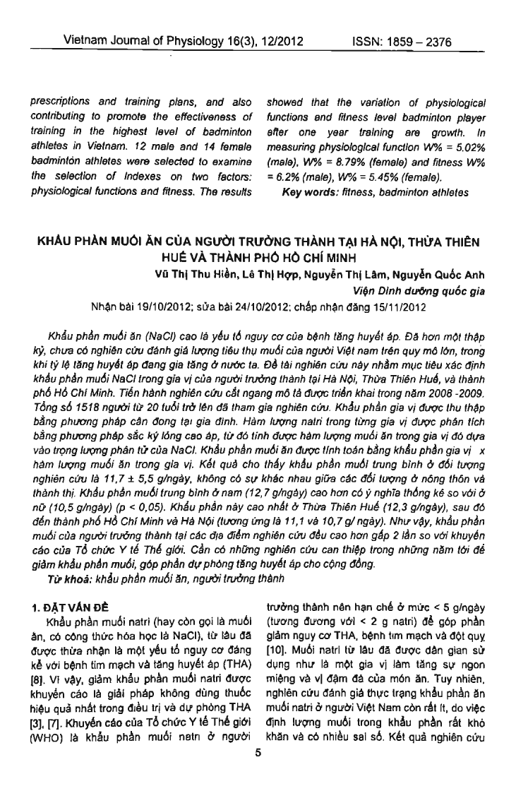 A high salt (NaCl) intake is a risk factor for hypertension. Over a decade there has been no study widely evaluating the salt intake of Vietnamese people while hypertension is increasing. The present study purposely assessed sodium cloride intake in seasoning in adults living in Hanoi city, Thua Thien Hue province, and Ho Chi Minh city. This was a cross-sectional study conducted in 2008-2009. A total of 1518 ,subjects aged over 20 participated in the study. Seasoning intake was evaluated by weighing method at household. Sodium content in seasonings was assessed by high-performance liquid chromatography (HPLC) method, then sodium salt content in the seasoning was calculated based on molecular weight of NaCI. Therefore, sodium salt intake was equal to amount of seasonings multiplied with the content of sodium salt in the seasonings. The results showed that, mean sodium salt intake in studied subjects was 11.7 + or - 5.5 g/day. No significant difference of salt intake between subjects living in urban and rural areas. Mean sodium salt intake in males (12.7 g/day) was higher than that in females (10.5 g/day) (p 0.05). The salt intake was highest in Thua Thien Hue (12.3 g/day), followed by Ho Chi Minh city (11.1 g/day) and Hanoi (10.7 g/day). Thus, sodium salt intakes in adults in studied sites were 2 times higher than that recommended by World Health Organization. Intervention studies should be done in the future to reduce salt intake in order to control high blood pressure in community.