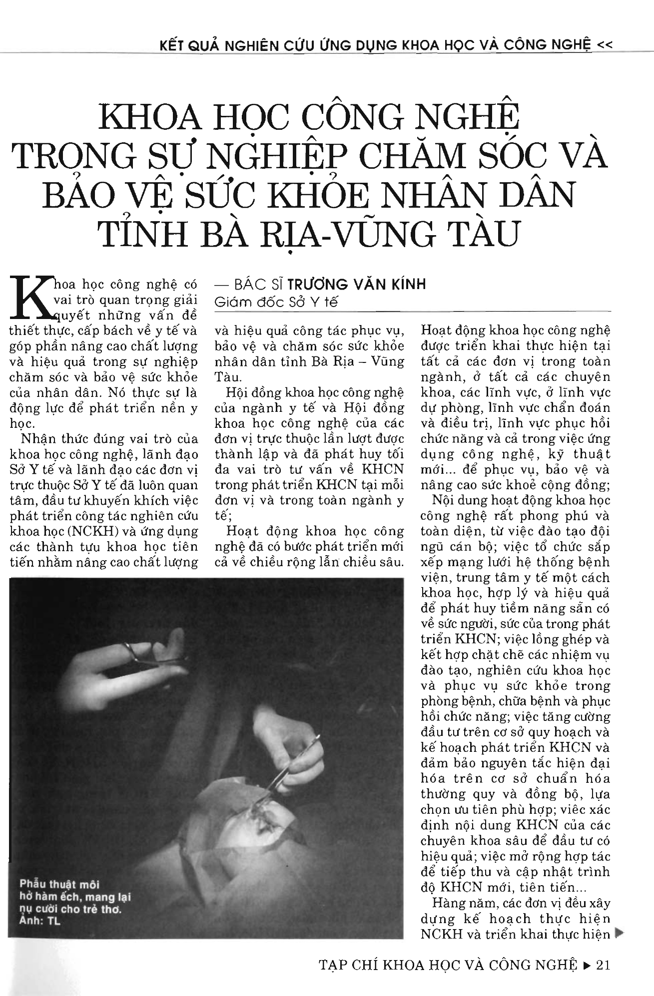 Khoa học công nghệ trong sự nghiệp chăm sóc và bảo vệ sức khoẻ nhân dân tỉnh Bà Rịa-Vũng Tàu.