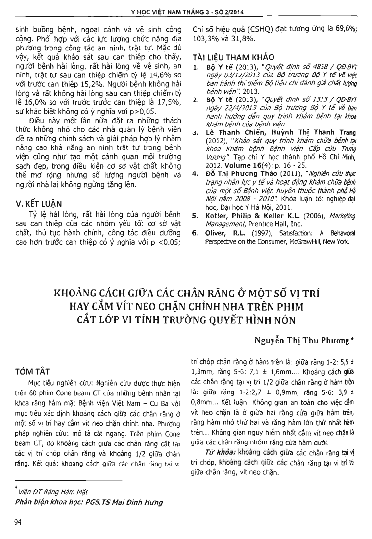 The research was carried out on 60 CBCT films of patients at the department of dentistry at Vietnam Cuba hospital. The goal was to determine the distance between the roots in some positions on which usually implant orthodontic anchorage screws. Reasearch methodology: cross-sectional describle study. On CBCT, measured the distance between the roots cutting at the apices and about one second of the roots. The results indicated the distance between the roots at the apices of maxillary teeth were: between teeth 1-2:5,5 + or - l,3mm, teeth 5-6: 7,1 + or - l,6mm.... The distance between roots at one second of the roots in the maxillary were: between teeth 1-2: 2,7 + or - 0,9mm, teeth 5-6: 3,9 + or - 0,8mm... Conclusions: The space for implantation of orthdontic anchorage screws between two central maxillary incisors, maxillary second premolar and first molar... is safe. The space for implantation of orthdontic anchorage screws between mandibular incisor roots is the most dangerous.