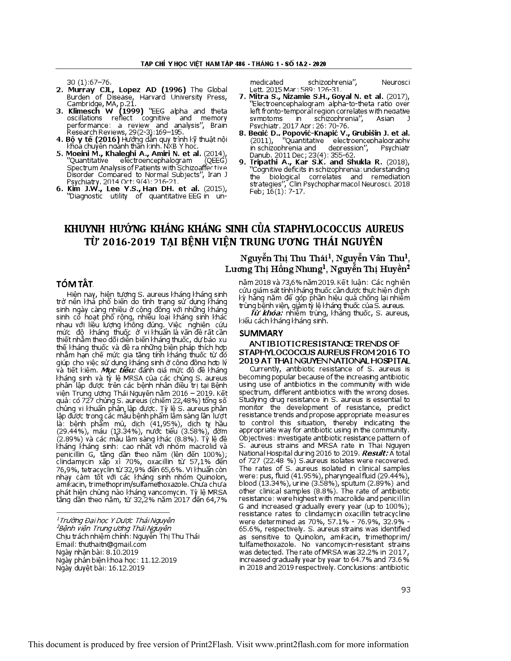 Hiện nay, hiện tượng S. aureus kháng kháng sinh trở nên khá phổ biến do tình trạng sử dụng kháng sinh ngày càng nhiều ở cộng đồng với những kháng sinh có hoạt phổ rộng, nhiều loại kháng sinh khác nhau với liều lượng không đúng. Việc nghiên cứu mức độ kháng thuốc ở vi khuân là vấn đề rất cần thiết nhằm theo dõi diễn biến kháng thuốc, dự báo xu thế kháng thuốc và đề ra những biện pháp thích hợp nhằm hạn chế mức gia tăng tính kháng thuốc từ đó giúp cho việc sử dụng kháng sinh ở công đồng hợp lý và tiết kiêm. Nghiên cứu có mục tiêu là đánh giá mức độ đề kháng kháng sinh và tỷ lệ MRSA của các chủng S. aureus phân lập được trên các bệnh nhân điều trị tại Bệnh viện Trung ương Thái Nguyên năm 2016 - 2019. Kết quả là có 727 chứng S. aureus (chiếm 22,48%) tổng số chủng vi khuẩn phân lập được. Tỷ lệ S. aureus phân lập được trong các mẫu bệnh phẩm lâm sàng lần lượt là bệnh phẩm mủ, dịch (41,95%), dịch tỵ hầu (29.44%), máu (18.34%), nước tiểu (3.58%), đờm (2.89%) và các mẫu lâm sàng khác (8.8%). Tỷ lệ đề kháng kháng sinh cao nhất với nhóm macrolid và penicillin G, tăng dần theo năm (lên đến 100%); clindamycin xấp xi 70%, oxacilin từ 57,1% đến 76,9%, tetracyclin từ 32,9% đến 65,6%. Vi khuẩn còn nhạy cảm tốt với các kháng sinh nhóm Quinolon, amikacin, trimethoprim/sufamethoxazole. Chưa chưa phát hiện chủng nào kháng vancomycin. Tỷ lệ MRSA tầng dân theo năm, từ 32,2% năm 2017 đến 64,7% năm 2018 và 73,6% năm 2019. Các nghiên cứu giám sát tính kháng thuốc cần được thực hiện định kỳ hàng năm để góp phần hiệu quả chống lại nhiễm trùng bệnh viện, giảm tỷ lệ kháng thuốc của 5S. aureus.