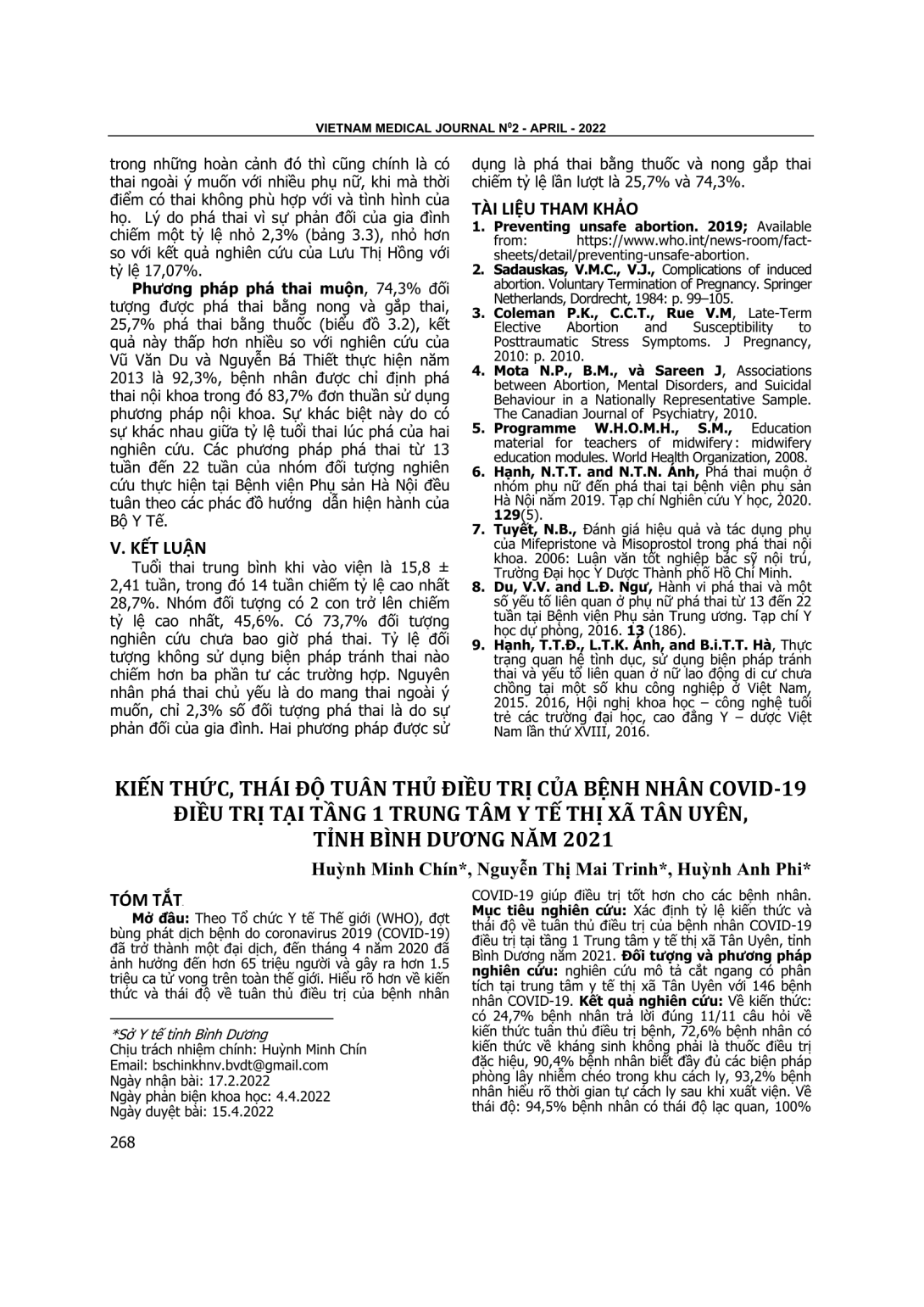 Theo Tổ chức Y tế Thế giới (WHO), đợt bùng phát dịch bệnh do coronavirus 2019 (COVID-19) đã trở thành một đại dịch, đến tháng 4 năm 2020 đã ảnh hưởng đến hơn 65 triệu người và gây ra hơn 1.5 triệu ca tử vong trên toàn thế giới. Hiểu rõ hơn về kiến thức và thái độ về tuân thủ điều trị của bệnh nhân COVID-19 giúp điều trị tốt hơn cho các bệnh nhân. Mục tiêu nghiên cứu: Xác định tỷ lệ kiến thức và thái độ về tuân thủ điều trị của bệnh nhân COVID-19 điều trị tại tầng 1 Trung tâm y tế thị xã Tân Uyên, tỉnh Bình Dương năm 2021. Đối tượng và phương pháp nghiên cứu: nghiên cứu mô tả cắt ngang có phân tích tại trung tâm y tế thị xã Tân Uyên với 146 bệnh nhân COVID-19. Kết quả nghiên cứu: Về kiến thức: có 24,7% bệnh nhân trả lời đúng 11/11 câu hỏi về kiến thức tuân thủ điều trị bệnh, 72,6% bệnh nhân có kiến thức về kháng sinh không phải là thuốc điều trị đặc hiệu, 90,4% bệnh nhân biết đầy đủ các biện pháp phòng lây nhiễm chéo trong khu cách ly, 93,2% bệnh nhân hiểu rõ thời gian tự cách ly sau khi xuất viện. Về thái độ: 94,5% bệnh nhân có thái độ lạc quan, 100% bệnh nhân đồng ý cách ly sau khi xuất viện, 93,2% đồng ý thực hiện đầy đủ các biện pháp phòng bệnh. Kết luận: Cần phải cải thiện, nâng cao hơn nữa kiến thức, thái độ về tuân thủ điều trị của bệnh nhân.