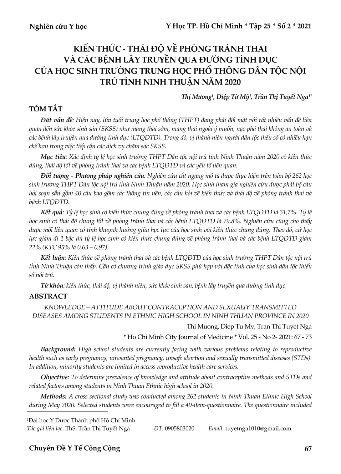 Xác định tỷ lệ học sinh trường THPT Dân tộc nội trú tỉnh Ninh Thuận năm 2020 có kiến thức đúng, thái độ tốt về phòng tránh thai và các bệnh LTQĐTD và các yếu tố liên quan. Đối tượng - Phương pháp nghiên cứu Nghiên cứu cắt ngang mô tả được thực hiện trên toàn bộ 262 học sinh trường THPT Dân tộc nội trú tỉnh Ninh Thuận năm 2020. Học sinh tham gia nghiên cứu được phát bộ câu hỏi soạn sẵn gồm 40 câu bao gồm các thông tin nền, các câu hỏi về kiến thức và thái độ về phòng tránh thai và bệnh LTQĐTD. Kết quả Tỷ lệ học sinh có kiến thức chung đúng về phòng tránh thai và các bệnh LTQĐTD là 31,7%. Tỷ lệ học sinh có thái độ chung tốt về phòng tránh thai và các bệnh LTQĐTD là 79,8%. Nghiên cứu cũng cho thấy được mối liên quan có tính khuynh hướng giữa học lực của học sinh với kiến thức chung đúng. Theo đó, cứ học lực giảm đi 1 bậc thì tỷ lệ học sinh có kiến thức chung đúng về phòng tránh thai và các bệnh LTQĐTD giảm 22% (KTC 95% là 0,63 – 0,97). Kết luận Kiến thức về phòng tránh thai và các bệnh LTQĐTD của học sinh trường THPT Dân tộc nội trú tỉnh Ninh Thuận còn thấp. Cần có chương trình giáo dục SKSS phù hợp với đặc tính của học sinh dân tộc thiểu số nội trú.