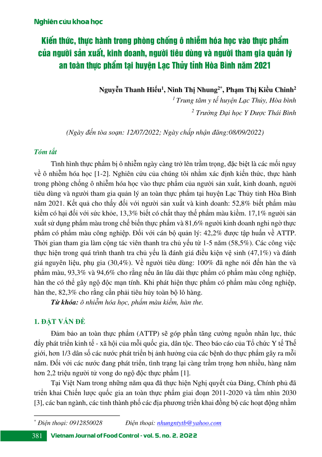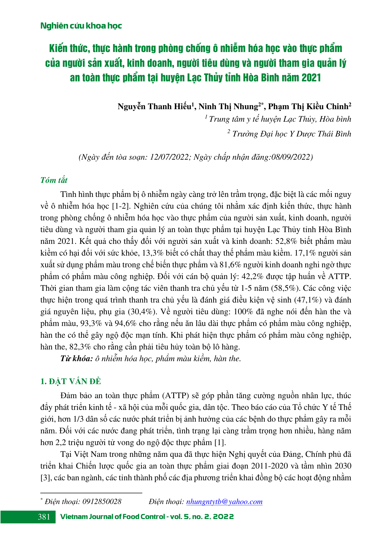 Tình hình thực phẩm bị ô nhiễm ngày càng trở lên trầm trọng, đặc biệt là các mối nguy về ô nhiễm hóa học [1-2]. Nghiên cứu của chúng tôi nhằm xác định kiến thức, thực hành trong phòng chống ô nhiễm hóa học vào thực phẩm của người sản xuất, kinh doanh, người tiêu dùng và người tham gia quản lý an toàn thực phẩm tại huyện Lạc Thủy tỉnh Hòa Bình năm 2021. Kết quả cho thấy đối với người sản xuất và kinh doanh: 52,8% biết phẩm màu kiềm có hại đối với sức khỏe, 13,3% biết có chất thay thế phẩm màu kiềm. 17,1% người sản xuất sử dụng phẩm màu trong chế biến thực phẩm và 81,6% người kinh doanh nghi ngờ thực phẩm có phẩm màu công nghiệp. Đối với cán bộ quản lý: 42,2% được tập huấn về ATTP. Thời gian tham gia làm cộng tác viên thanh tra chủ yếu từ 1-5 năm (58,5%). Các công việc thực hiện trong quá trình thanh tra chủ yếu là đánh giá điều kiện vệ sinh (47,1%) và đánh giá nguyên liệu, phụ gia (30,4%). Về người tiêu dùng: 100% đã nghe nói đến hàn the và phẩm màu, 93,3% và 94,6% cho rằng nếu ăn lâu dài thực phẩm có phẩm màu công nghiệp, hàn the có thể gây ngộ độc mạn tính. Khi phát hiện thực phẩm có phẩm màu công nghiệp, hàn the, 82,3% cho rằng cần phải tiêu hủy toàn bộ lô hàng.