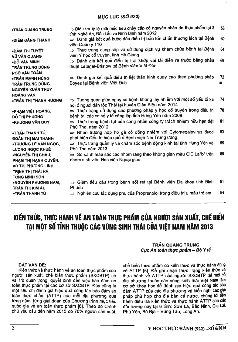 The paper mentions situation of the knowledge and practice on the food safety from production and processing of participants in a number of provinces under different ecological zones of Vietnam in 2013.