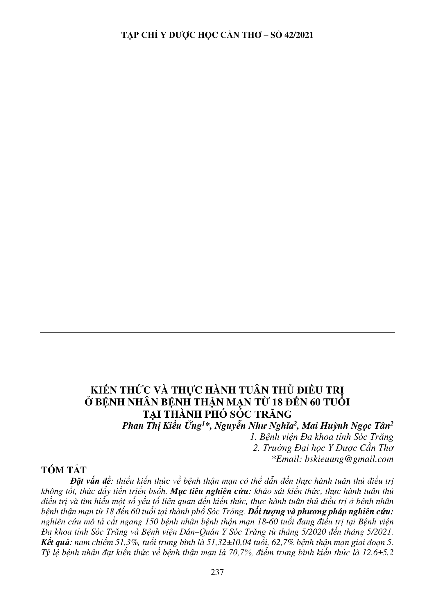 Thiếu kiến thức về bệnh thận mạn có thể dẫn đến thực hành tuân thủ điều trị không tốt, thúc đẩy tiến triển bsốh. Mục tiêu nghiên cứu: khảo sát kiến thức, thực hành tuân thủ điều trị và tìm hiểu một số yếu tố liên quan đến kiến thức, thực hành tuân thủ điều trị ở bệnh nhân bệnh thận mạn từ 18 đến 60 tuổi tại thành phố Sóc Trăng. Đối tượng và phương pháp nghiên cứu: nghiên cứu mô tả cắt ngang 150 bệnh nhân bệnh thận mạn 18-60 tuổi đang điều trị tại Bệnh viện Đa khoa tỉnh Sóc Trăng và Bệnh viện Dân–Quân Y Sóc Trăng từ tháng 5/2020 đến tháng 5/2021. Kết quả: nam chiếm 51,3%, tuổi trung bình là 51,32±10,04 tuổi, 62,7% bệnh thận mạn giai đoạn 5. Tỷ lệ bệnh nhân đạt kiến thức về bệnh thận mạn là 70,7%, điểm trung bình kiến thức là 12,6±5,2 điểm. Có 56% bệnh nhân thực hành đạt với điểm trung bình là 13,2±4,9 điểm. Có mối tương quan thuận mức độ chặt giữa kiến thức và thực hành tuân thủ điều trị bệnh thận mạn (r=0,71, p=0,001), tương quan nghịch mức độ vừa giữa mức lọc cầu thận và điểm kiến thức (r = -0,42, p=0,001). Có mối liên quan giữa kiến thức và dân tộc, trình độ học vấn và điều kiện kinh tế. Các yếu tố liên quan đến thực hành đạt gồm: giới nữ, dân tộc Kinh, Hoa và học vấn từ trung học phổ thông trở lên (p<0,05). Kết luận: kiến thức có tương quan chặt với thực hành, cần giáo dục để bệnh nhân thực hành điều trị tốt bệnh thận mạn