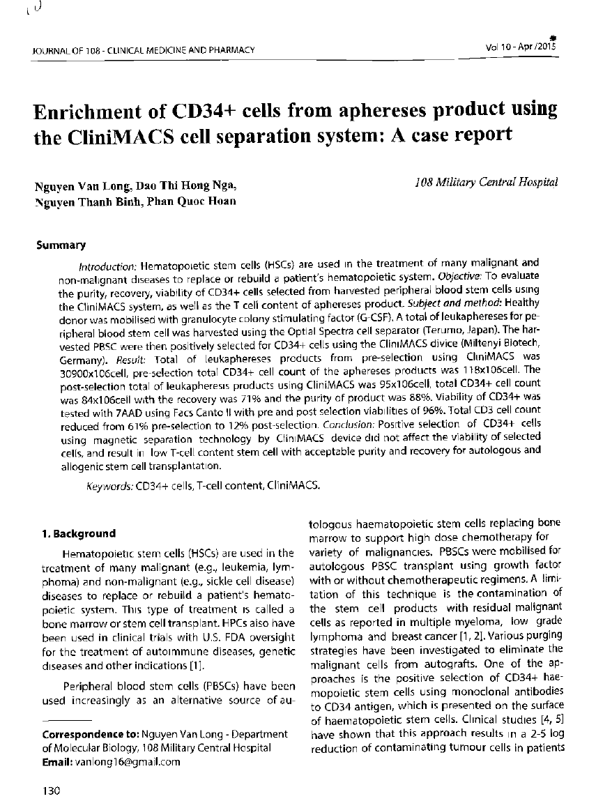 Introduction: Hematopoietic stem cells (HSCs) are used in the treatment of many malignant and non-malignant diseases to replace or rebuild a patient's hematopoietic system. Objective: To evaluate the purity, recovery, viability of CD34+ cells selected from harvested peripheral blood stem cells using the CliniMACS system (as well as the T cell content of aphereses product. Subject and method: Healthy donor was mobilised with granulocyte colony stimulating factor (G-CSF). A total of leukaphereses for peripheral blood stem cell was harvested using the Optial Spectra cell separator (Terumo, Japan). The harvested PBSC were then positively selected for CD34+ cells using the CliniMACS divice (Miltenyi Biotech, Germany). Result: Total of leukaphereses products from pre-selection using CliniMACS was 30900 x 106cell, pre-selection total CD34+ cell count of the aphereses products was 118 x 106 cell. The post-selection total of leukapheresis products using CliniMACS was 95 x 106 cell, total CD34+ cell count was 84 x 106 cell with the recovery was 71 percent and the purity of product was 88 percent. Viability of CD34+ was tested with 7AAD using Facs Canto II with pre and post selection viabilities of 96 percent. Total CD3 cell count reduced from 61 percent pre-selection to 12 percent post-selection. Conclusion: Positive selection of CD34+ cells using magnetic separation technology by CliniMACS device did not affect the viability of selected cells, and result in low T-cell content stem cell with acceptable purity and recovery for autologous and allogenic stem cell transplantation.