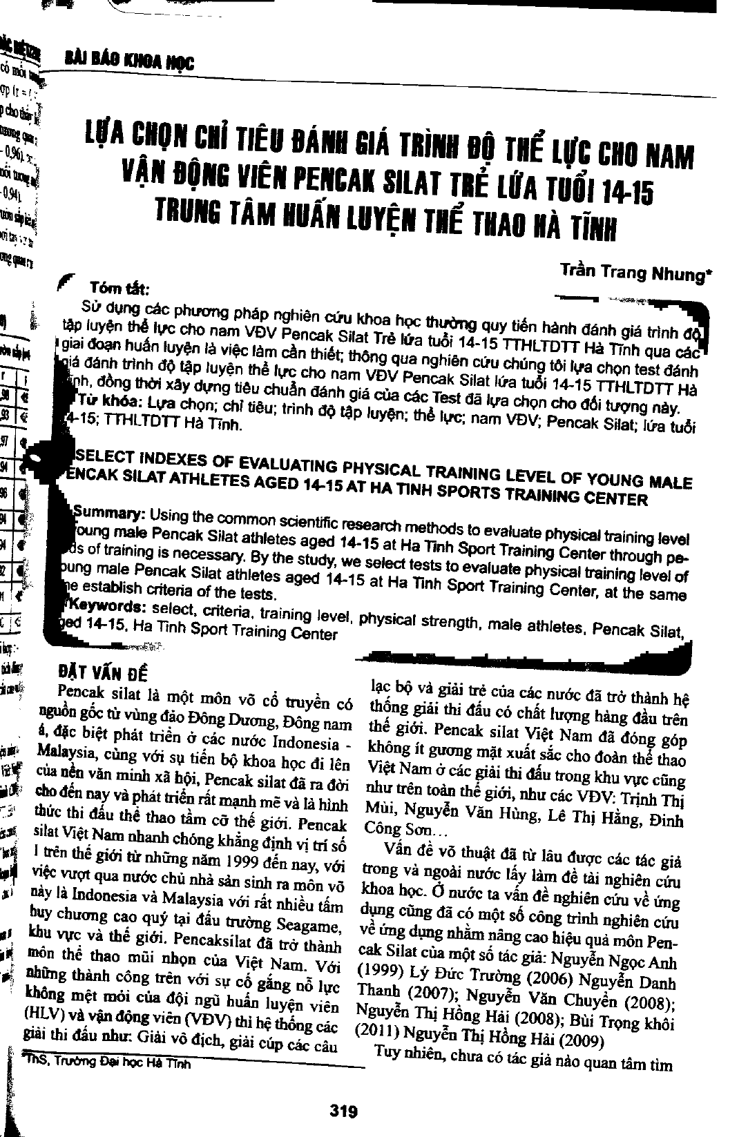 Lựa chọn chỉ tiêu đánh giá trình độ thể lực cho nam vận động viên pencak silat trẻ lứa tuổi 14-15 trung tâm huấn luyện thể thao Hà Tĩnh