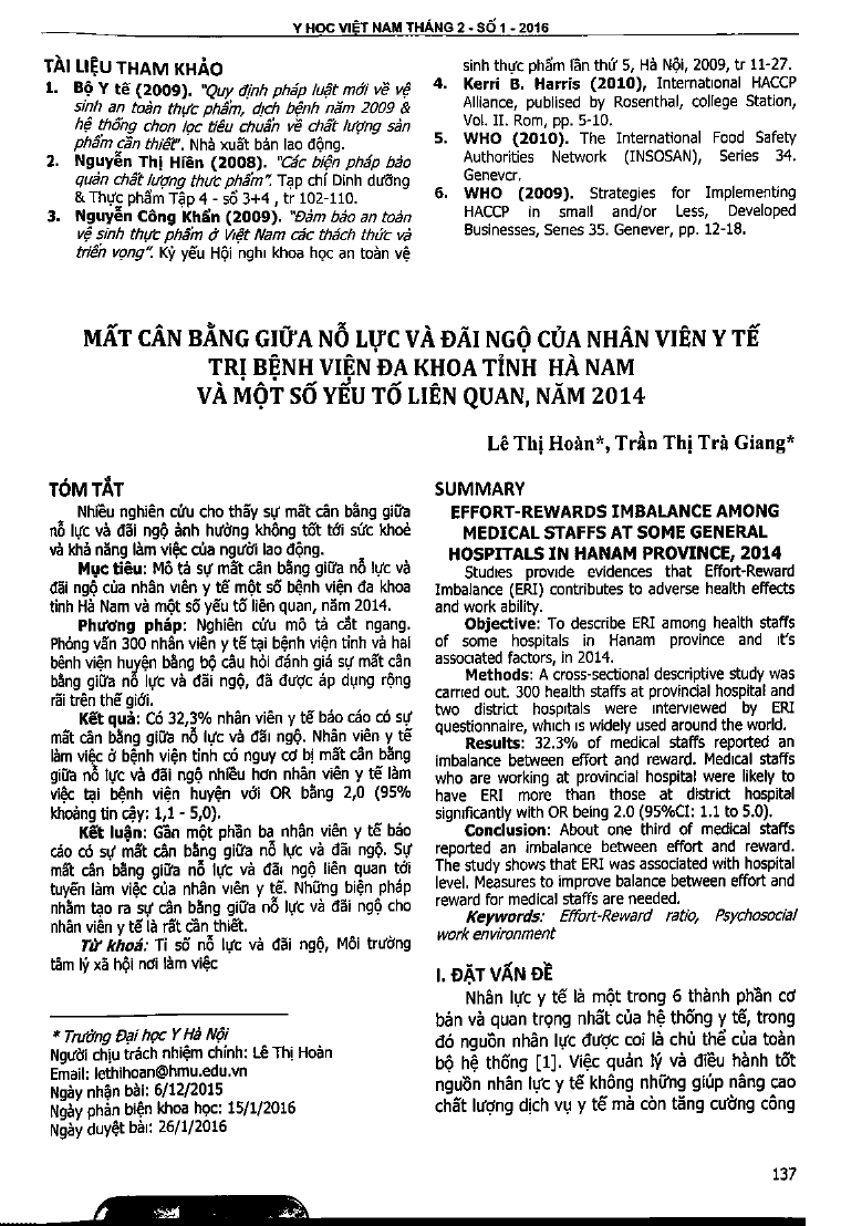 Mất cân bằng giữa nỗ lực và đãi ngộ của nhân viên y tế trị, Bệnh viện Đa khoa tỉnh Hà Nam và một số yếu tố liên quan, năm 2014