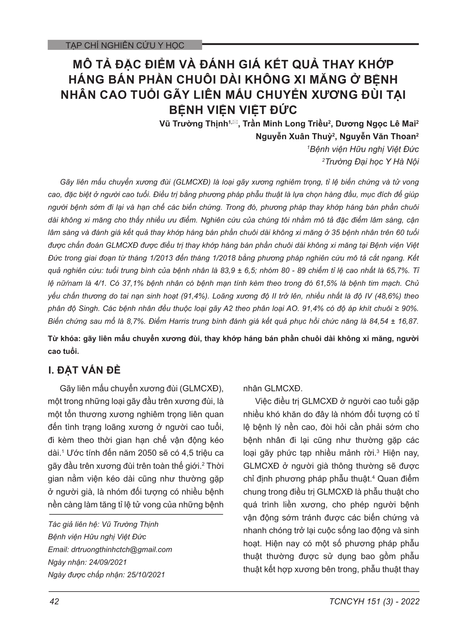 Gãy liên mấu chuyển xương đùi (GLMCXĐ) là loại gãy xương nghiêm trọng, tỉ lệ biến chứng và tử vong cao, đặc biệt ở người cao tuổi. Điều trị bằng phương pháp phẫu thuật là lựa chọn hàng đầu, mục đích để giúp người bệnh sớm đi lại và hạn chế các biến chứng. Trong đó, phương pháp thay khớp háng bán phần chuôi dài không xi măng cho thấy nhiều ưu điểm. Nghiên cứu của chúng tôi nhằm mô tả đặc điểm lâm sàng, cận lâm sàng và đánh giá kết quả thay khớp háng bán phần chuôi dài không xi măng ở 35 bệnh nhân trên 60 tuổi được chẩn đoán GLMCXĐ được điều trị thay khớp háng bán phần chuôi dài không xi măng tại Bệnh viện Việt Đức trong giai đoạn từ tháng 1/2013 đến tháng 1/2018 bằng phương pháp nghiên cứu mô tả cắt ngang. Kết quả nghiên cứu: tuổi trung bình của bệnh nhân là 83,9 ± 6,5; nhóm 80 - 89 chiếm tỉ lệ cao nhất là 65,7%. Tỉ lệ nữ/nam là 4/1. Có 37,1% bệnh nhân có bệnh mạn tính kèm theo trong đó 61,5% là bệnh tim mạch. Chủ yếu chấn thương do tai nạn sinh hoạt (91,4%). Loãng xương độ II trở lên, nhiều nhất là độ IV (48,6%) theo phân độ Singh. Các bệnh nhân đều thuộc loại gãy A2 theo phân loại AO. 91,4% có độ áp khít chuôi ≥ 90%. Biến chứng sau mổ là 8,7%. Điểm Harris trung bình đánh giá kết quả phục hồi chức năng là 84,54 ± 16,87.