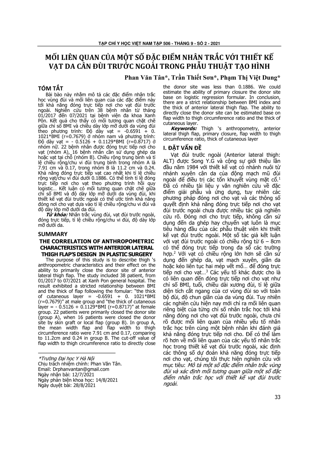 Mô tả các đặc điểm nhân trắc học vùng đùi và mối liên quan của các đặc điểm này tới khả năng đóng trực tiếp nơi cho vạt đùi trước ngoài. Nghiên cứu trên 38 bệnh nhân từ tháng 01/2017 đến 07/2021 tại bệnh viện đa khoa Xanh Pôn. Kết quả cho thấy có mối tương quan chặt chẽ giữa chỉ số BMI và chiều dày lớp mỡ dưới da vùng đùi theo phương trình: Độ dày vạt = -0.6591 + 0. 1021*BMI (r=0.7679) ở nhóm nam và phương trình: Độ dày vạt = - 0.5126 + 0.1129*BMI (r=0.8717) ở nhóm nữ. 22 bệnh nhân được đóng trực tiếp nơi cho vạt (nhóm A), 16 bệnh nhân cần sử dụng ghép da hoặc vạt tại chỗ (nhóm B). Chiều rộng trung bình và tỉ lệ chiều rộng/chu vi đùi trung bình trong nhóm A là 7.91 cm và 0.17, trong nhóm B là 11.2 cm và 0.24. Khả năng đóng trực tiếp vạt cao nhất khi tỉ lệ chiều rộng vạt/chu vi đùi dưới 0.1886. Có thể tính tỉ lệ đóng trực tiếp nơi cho vạt theo phương trình hồi quy logistic… Kết luận có mối tương quan chặt chẽ giữa chỉ số BMI và độ dày lớp mỡ dưới da vùng đùi, khi thiết kế vạt đùi trước ngoài có thể ước tính khả năng đóng nơi cho vạt dựa vào tỉ lệ chiều rộng/chu vi đùi và độ dày lớp mỡ dưới da đùi.