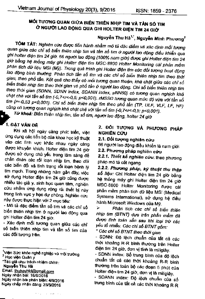 66 người lao động (100 phần trăm là nam giới) được ghi Holter điện tim 24 giờ bằng hệ thống máy ghi Holter điện tim MSC-8800 Holter Monitoring cài phần mềm phân tích dữ liệu MSI. Kết quả cho thấy có mối tương quan thuận, khá chặt chẽ giữa các chỉ số biến thiên nhịp tim theo thời gian và phổ tần ở người lao động. Chỉ số biến thiên nhịp tim theo thời gian có mối tương quan nghịch, khá chặt chẽ với tần số tim. Chỉ số biến thiên nhịp tim theo phổ tần có tương quan nghịch khá chặt chẽ với tần số tim.
