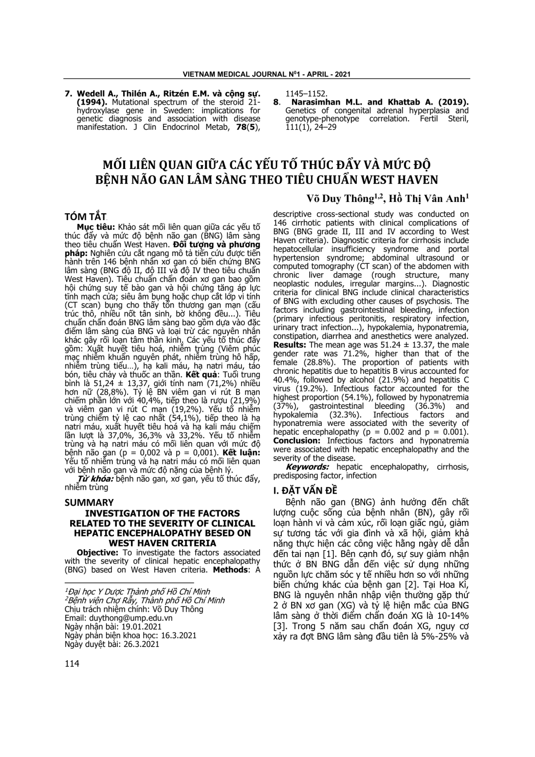 Khảo sát mối liên quan giữa các yếu tố thúc đẩy và mức độ bệnh não gan (BNG) lâm sàng theo tiêu chuẩn West Haven. Đối tượng và phương pháp Nghiên cứu cắt ngang mô tả tiến cứu được tiến hành trên 146 bệnh nhân xơ gan có biến chứng BNG lâm sàng (BNG độ II, độ III và độ IV theo tiêu chuẩn West Haven). Tiêu chuẩn chẩn đoán xơ gan bao gồm hội chứng suy tế bào gan và hội chứng tăng áp lực tĩnh mạch cửa; siêu âm bụng hoặc chụp cắt lớp vi tính (CT scan) bụng cho thấy tổn thương gan mạn (cấu trúc thô, nhiều nốt tân sinh, bờ không đều...). Tiêu chuẩn chẩn đoán BNG lâm sàng bao gồm dựa vào đặc điểm lâm sàng của BNG và loại trừ các nguyên nhân khác gây rối loạn tâm thần kinh. Các yếu tố thúc đẩy gồm Xuất huyết tiêu hoá, nhiễm trùng (Viêm phúc mạc nhiễm khuẩn nguyên phát, nhiễm trùng hô hấp, nhiễm trùng tiểu…), hạ kali máu, hạ natri máu, táo bón, tiêu chảy và thuốc an thần. Kết quả Tuổi trung bình là 51,24 ± 13,37, giới tính nam (71,2%) nhiều hơn nữ (28,8%). Tỷ lệ BN viêm gan vi rút B mạn chiếm phần lớn với 40,4%, tiếp theo là rượu (21,9%) và viêm gan vi rút C mạn (19,2%). Yếu tố nhiễm trùng chiếm tỷ lệ cao nhất (54,1%), tiếp theo là hạ natri máu, xuất huyết tiêu hoá và hạ kali máu chiếm lần lượt là 37,0%, 36,3% và 33,2%. Yếu tố nhiễm trùng và hạ natri máu có mối liên quan với mức độ bệnh não gan (p = 0,002 và p = 0,001). Kết luận Yếu tố nhiễm trùng và hạ natri máu có mối liên quan với bệnh não gan và mức độ nặng của bệnh lý.