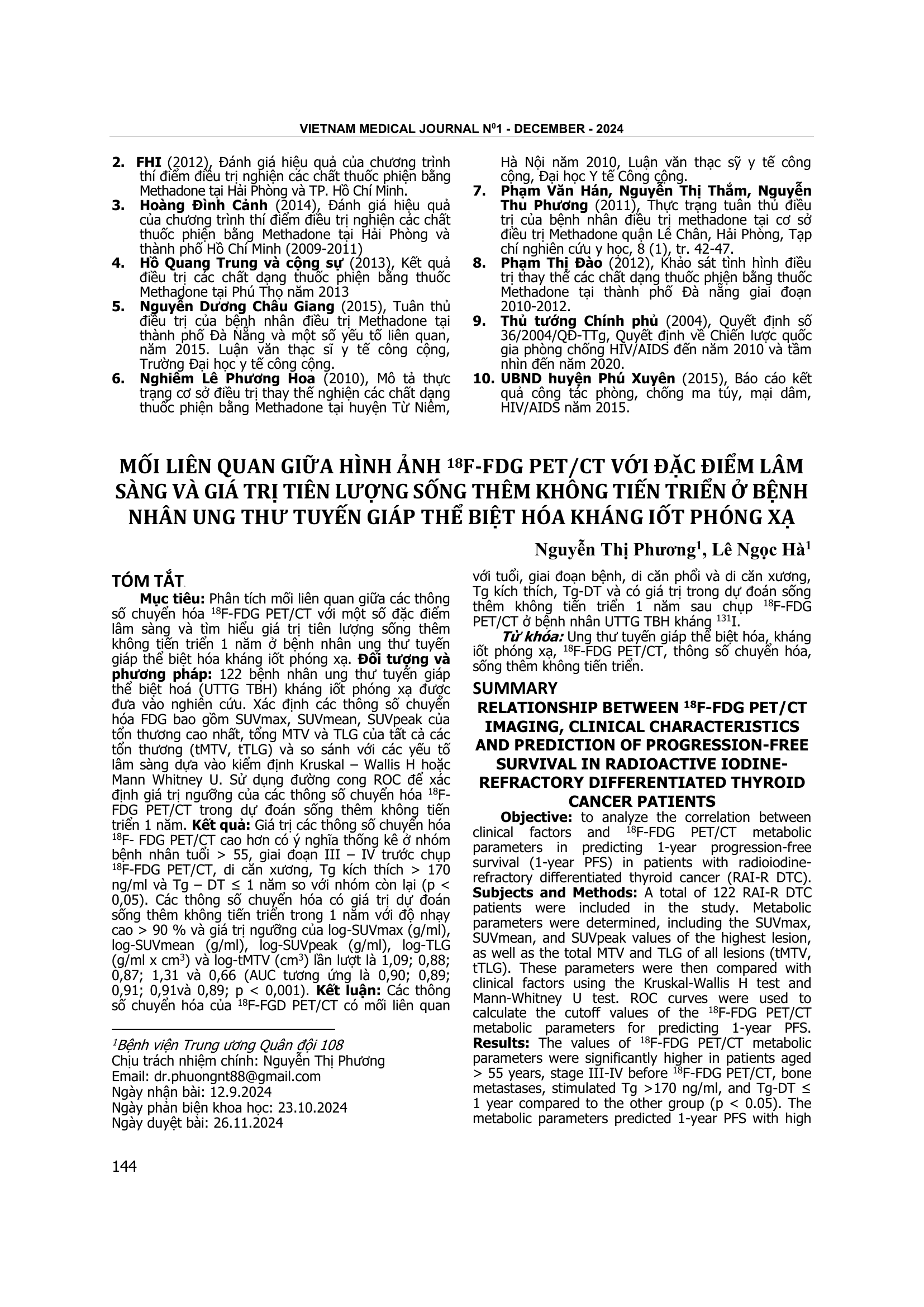 Phân tích mối liên quan giữa các thông số chuyển hóa 18F-FDG PET/CT với một số đặc điểm lâm sàng và tìm hiểu giá trị tiên lượng sống thêm không tiến triển 1 năm ở bệnh nhân ung thư tuyến giáp thể biệt hóa kháng iốt phóng xạ. Đối tượng và phương pháp: 122 bệnh nhân ung thư tuyến giáp thể biệt hoá (UTTG TBH) kháng iốt phóng xạ được đưa vào nghiên cứu. Xác định các thông số chuyển hóa FDG bao gồm SUVmax, SUVmean, SUVpeak của tổn thương cao nhất, tổng MTV và TLG của tất cả các tổn thương (tMTV, tTLG) và so sánh với các yếu tố lâm sàng dựa vào kiểm định Kruskal – Wallis H hoặc Mann Whitney U. Sử dụng đường cong ROC để xác định giá trị ngưỡng của các thông số chuyển hóa 18F-FDG PET/CT trong dự đoán sống thêm không tiến triển 1 năm. Kết quả: Giá trị các thông số chuyển hóa 18F- FDG PET/CT cao hơn có ý nghĩa thống kê ở nhóm bệnh nhân tuổi > 55, giai đoạn III – IV trước chụp 18F-FDG PET/CT, di căn xương, Tg kích thích > 170 ng/ml và Tg – DT ≤ 1 năm so với nhóm còn lại (p < 0,05). Các thông số chuyển hóa có giá trị dự đoán sống thêm không tiến triển trong 1 năm với độ nhạy cao > 90 % và giá trị ngưỡng của log-SUVmax (g/ml), log-SUVmean (g/ml), log-SUVpeak (g/ml), log-TLG (g/ml x cm3) và log-tMTV (cm3) lần lượt là 1,09; 0,88; 0,87; 1,31 và 0,66 (AUC tương ứng là 0,90; 0,89; 0,91; 0,91và 0,89; p < 0,001). Kết luận: Các thông số chuyển hóa của 18F-FGD PET/CT có mối liên quan với tuổi, giai đoạn bệnh, di căn phổi và di căn xương, Tg kích thích, Tg-DT và có giá trị trong dự đoán sống thêm không tiến triển 1 năm sau chụp 18F-FDG PET/CT ở bệnh nhân UTTG TBH kháng 131I.
