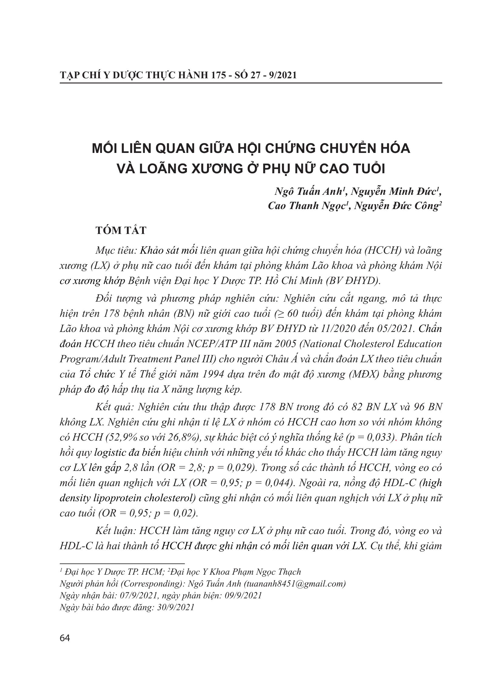 Khảo sát mối liên quan giữa hội chứng chuyển hóa (HCCH) và loãng xương (LX) ở phụ nữ cao tuổi đến khám tại phòng khám Lão khoa và phòng khám Nội cơ xương khớp Bệnh viện Đại học Y Dược TP. Hồ Chí Minh (BV ĐHYD). Đối tượng và phương pháp nghiên cứu: Nghiên cứu cắt ngang, mô tả thực hiện trên 178 bệnh nhân (BN) nữ giới cao tuổi (≥ 60 tuổi) đến khám tại phòng khám Lão khoa và phòng khám Nội cơ xương khớp BV ĐHYD từ 11/2020 đến 05/2021. Chẩn đoán HCCH theo tiêu chuẩn NCEP/ATP III năm 2005 (National Cholesterol Education Program/Adult Treatment Panel III) cho người Châu Á và chẩn đoán LX theo tiêu chuẩn của Tổ chức Y tế Thế giới năm 1994 dựa trên đo mật độ xương (MĐX) bằng phương pháp đo độ hấp thụ tia X năng lượng kép. Kết quả: Nghiên cứu thu thập được 178 BN trong đó có 82 BN LX và 96 BN không LX. Nghiên cứu ghi nhận tỉ lệ LX ở nhóm có HCCH cao hơn so với nhóm không có HCCH (52,9% so với 26,8%), sự khác biệt có ý nghĩa thống kê (p = 0,033). Phân tích hồi quy logistic đa biến hiệu chỉnh với những yếu tố khác cho thấy HCCH làm tăng nguy cơ LX lên gấp 2,8 lần (OR = 2,8; p = 0,029). Trong số các thành tố HCCH, vòng eo có mối liên quan nghịch với LX (OR = 0,95; p = 0,044). Ngoài ra, nồng độ HDL-C (high density lipoprotein cholesterol) cũng ghi nhận có mối liên quan nghịch với LX ở phụ nữ cao tuổi (OR = 0,95; p = 0,02).