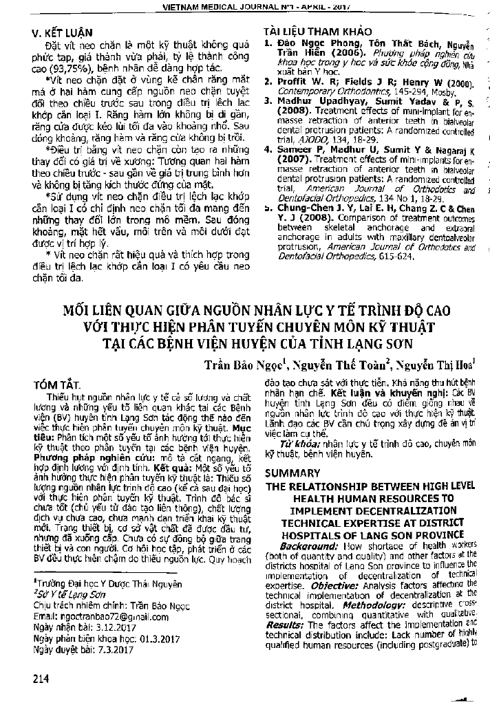 Mối liên quan giữa nguồn nhân lực y tế trình độ cao với thực hiện phân tuyến chuyên môn kỹ thuật tại các bệnh viện huyện của tỉnh Lạng Sơn