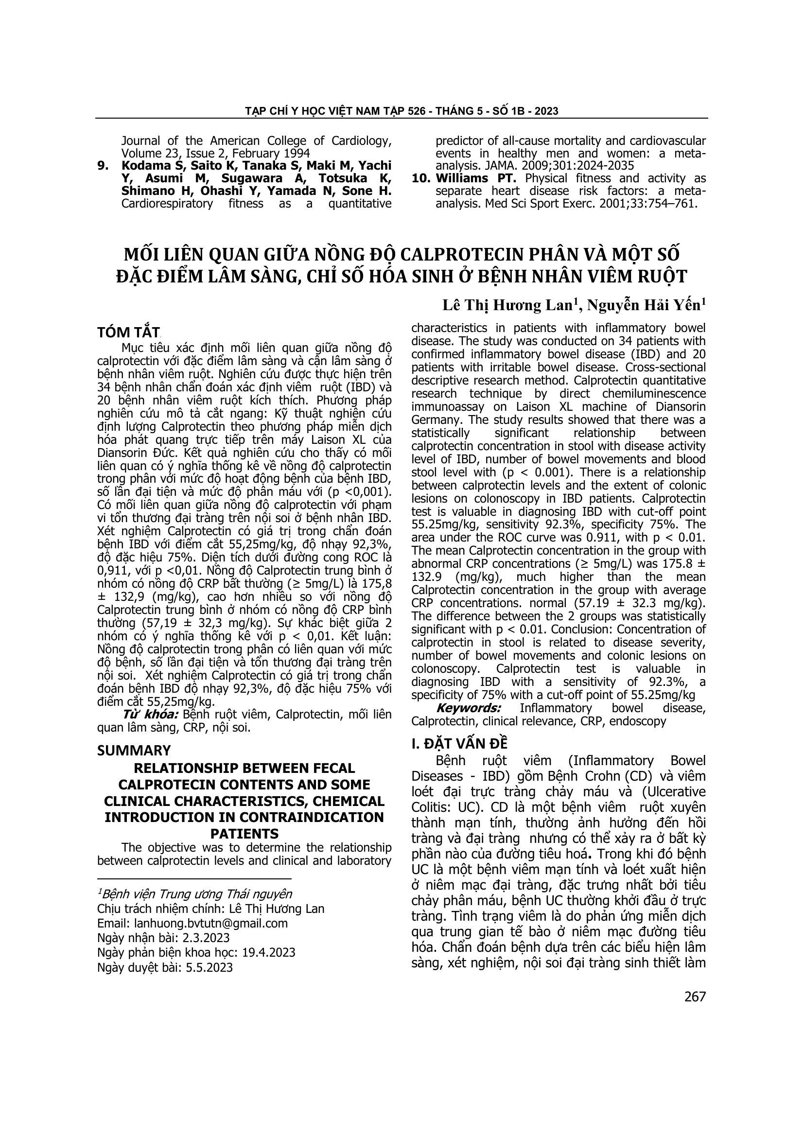 Mục tiêu xác định mối liên quan giữa nồng độ calprotectin với đặc điểm lâm sàng và cận lâm sàng ở bệnh nhân viêm ruột. Nghiên cứu được thực hiện trên 34 bệnh nhân chẩn đoán xác định viêm ruột (IBD) và 20 bệnh nhân viêm ruột kích thích. Phương pháp nghiên cứu mô tả cắt ngang: Kỹ thuật nghiên cứu định lượng Calprotectin theo phương pháp miễn dịch hóa phát quang trực tiếp trên máy Laison XL của Diansorin Đức. Kết quả nghiên cứu cho thấy có mối liên quan có ý nghĩa thống kê về nồng độ calprotectin trong phân với mức độ hoạt động bệnh của bệnh IBD, số lần đại tiện và mức độ phân máu với (p <0,001). Có mối liên quan giữa nồng độ calprotectin với phạm vi tổn thương đại tràng trên nội soi ở bệnh nhân IBD. Xét nghiệm Calprotectin có giá trị trong chẩn đoán bệnh IBD với điểm cắt 55,25mg/kg, độ nhạy 92,3%, độ đặc hiệu 75%. Diện tích dưới đường cong ROC là 0,911, với p <0,01. Nồng độ Calprotectin trung bình ở nhóm có nồng độ CRP bất thường (≥ 5mg/L) là 175,8 ± 132,9 (mg/kg), cao hơn nhiều so với nồng độ Calprotectin trung bình ở nhóm có nồng độ CRP bình thường (57,19 ± 32,3 mg/kg). Sự khác biệt giữa 2 nhóm có ý nghĩa thống kê với p < 0,01. Kết luận: Nồng độ calprotectin trong phân có liên quan với mức độ bệnh, số lần đại tiện và tổn thương đại tràng trên nội soi. Xét nghiệm Calprotectin có giá trị trong chẩn đoán bệnh IBD độ nhạy 92,3%, độ đặc hiệu 75% với điểm cắt 55,25mg/kg.