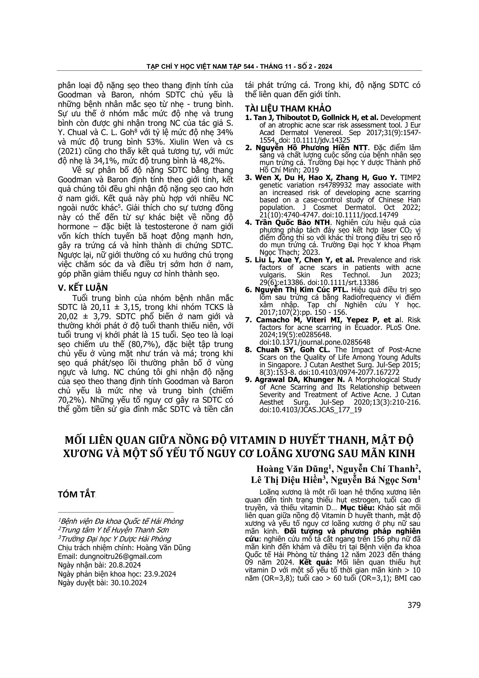 Khảo sát mối liên quan giữa nồng độ Vitamin D huyết thanh, mật độ xương và yếu tố nguy cơ loãng xương ở phụ nữ sau mãn kinh. Đối tượng và phương pháp nghiên cứu: nghiên cứu mô tả cắt ngang trên 156 phụ nữ đã mãn kinh đến khám và điều trị tại Bệnh viện đa khoa Quốc tế Hải Phòng từ tháng 12 năm 2023 đến tháng 09 năm 2024. Kết quả: Mối liên quan thiếu hụt vitamin D với một số yếu tố thời gian mãn kinh > 10 năm (OR=3,8); tuổi cao > 60 tuổi (OR=3,1); BMI cao (OR=2,1); số lần sinh con ≥ 3 lần (OR=2,6) (p<,0,05). Mối liên quan tỷ lệ loãng xương với thời gian mãn kinh > 10 năm (OR=3,1), tuổi cao (OR=2,4) (p<0,05). Kết luận: Nghiên cứu cho thấy tỷ lệ thiếu vitamin D ở phụ nữ sau mãn kinh là cao (85,3%), với tỷ lệ loãng xương cũng đáng kể (44,2%). Các yếu tố nguy cơ bao gồm thời gian mãn kinh trên 10 năm, tuổi từ 60 trở lên, chỉ số BMI cao, số lần sinh con từ 3 lần trở lên. Có mối liên quan đáng kể với nguy cơ thiếu hụt vitamin D và loãng xương.