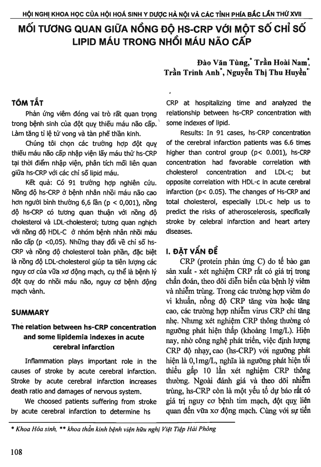 Mối tương quan giữa nồng độ HS-CRP với một số chỉ số Lipid máu trong nhồi máu não cấp