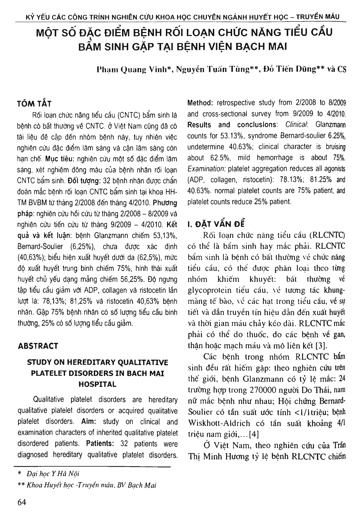 Qualitative platelet disorders are hereditary qualitative platelet disorders or acquired qualitative platelet disorders. Aim: study on clinical and examination characters of inherited qualitative platelet disordered patients. Patients: 32 patients were diagnosed hereditary qualitative platelet disorders. Method: retrospective study from 2/2008 to 8/2009 and cross-sectional survey from 9/2009 to 4/2010. Results and conclusions: Clinical: Glanzmann counts for 53.13 percent, syndrome Bernard-soulier 6.25 percent, undetermine 40.63 percent; clinical character is bruising about 62.5 percent, mild hemorrhage is about 75 percent.