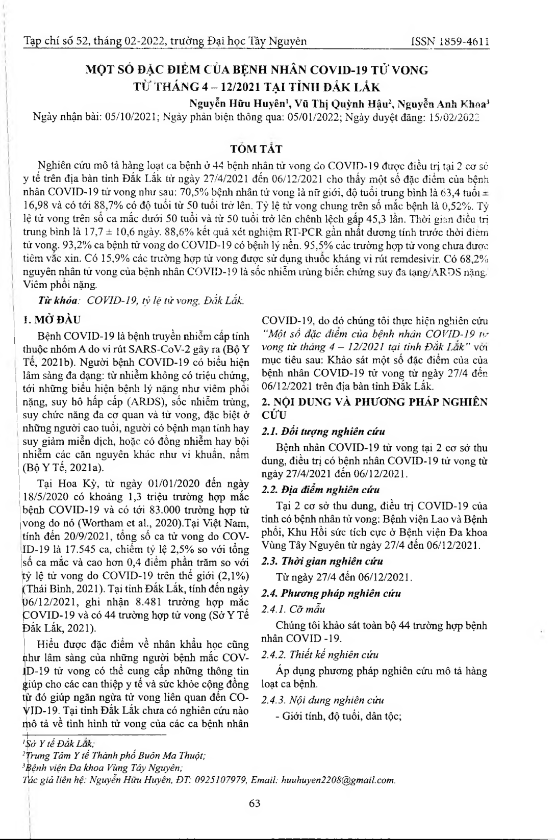 Nghiên cứu mô tả hàng loạt ca bệnh ở 44 bệnh nhân tử vong do COVID-19 được điều trị tại 2 cơ sở y tế trên địa bàn tỉnh Đắk Lắk từ ngày 27/4/2021 đến 06/12/2021 cho thấy một số đặc điểm của bệnh nhân COVID-19 tử vong như sau: 70,5% bệnh nhân tử vong là nữ giới, độ tuổi trung bình là 63,4 tuổi ± 16,98 và có tới 88,7% có độ tuổi từ 50 tuổi trở lên. Tỷ lệ tử vong chung trên số mắc bệnh là 0,52%. Tỷ lệ tử vong trên số ca mắc dưới 50 tuổi và từ 50 tuổi trở lên chênh lệch gấp 45,3 lần. Thời gian điều trị trung bình là 17,7 ± 10,6 ngày. 88,6% kết quả xét nghiệm RT-PCR gần nhất dương tính trước thời điểm tử vong. 93,2% ca bệnh tử vong do COVID-19 có bệnh lý nền. 95,5% các trường hợp tử vong chưa được tiêm vắc xin. Có 15,9% các trường hợp tử vong được sử dụng thuốc kháng vi rút remdesivir. Có 68,2% nguyên nhân tử vong của bệnh nhân COVID-19 là sốc nhiễm trùng biến chứng suy đa tạng/ARDS nặng/ Viêm phổi nặng.