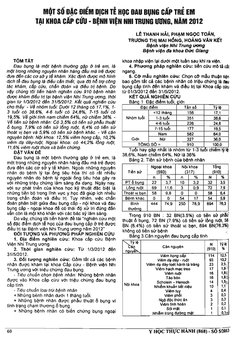 Một số đặc điểm dịch tễ học đau bụng cấp trẻ em tại khoa cấp cứu - bệnh viện Nhi Trung ương năm 2012
